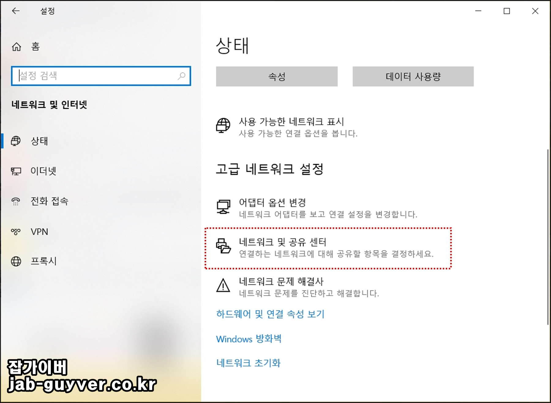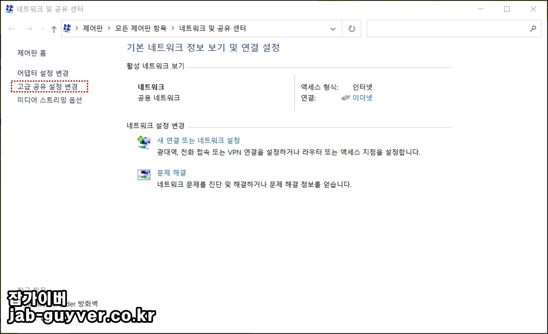 여기에서 네트워크 및 공유 센터 메뉴로 진입하면 좀 더 자세한 설정이 보입니다.