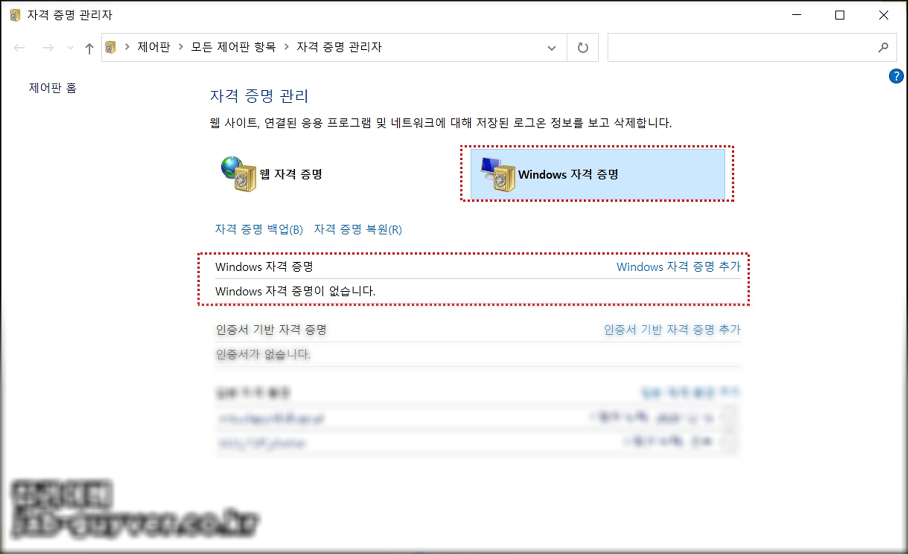 - Windows 자격 증명 – 공유폴더, 네트워크 장치 등 윈도우 내부에서 쓰는 계정 정보