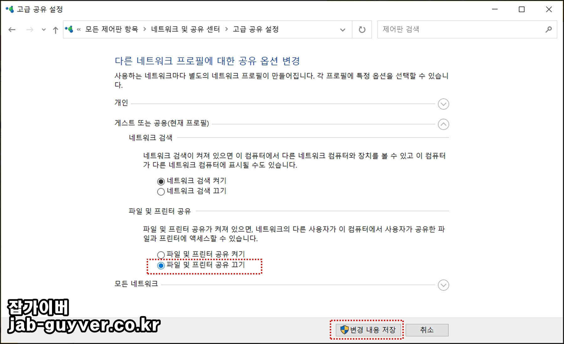 왼쪽 메뉴에서 고급 공유 설정 변경을 선택하면 공유폴더와 프린터가 보이는 방식, 암호 보호 여부 등을 한 번에 조정할 수 있는 화면이 나타납니다.