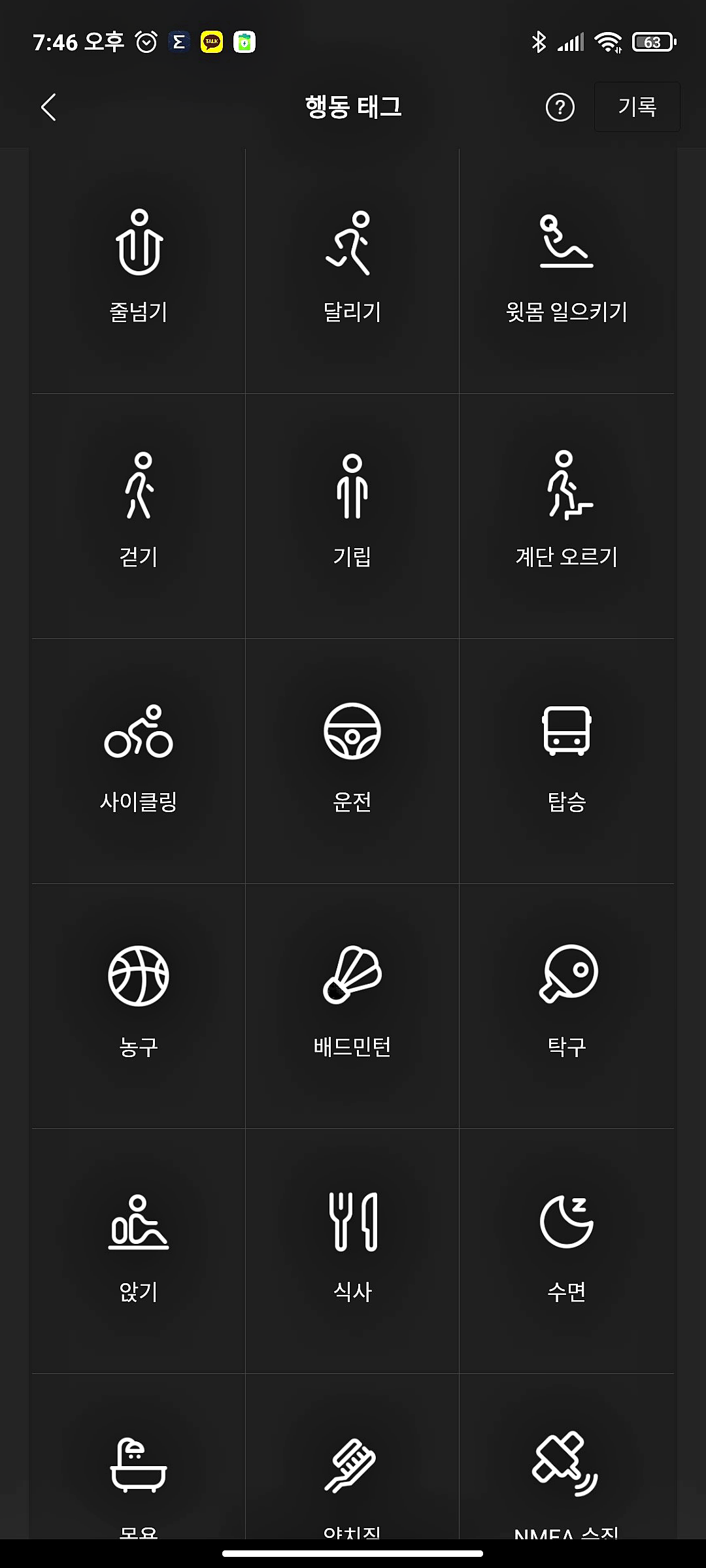 걷기, 기립, 계단 오르기, 사이클링"자전거", 자동차 운전, 대중교통 탑승, 농구, 배드민턴, 탁구, 앉기, 식사, 수면, 목욕, 양치질, NMEA수집,