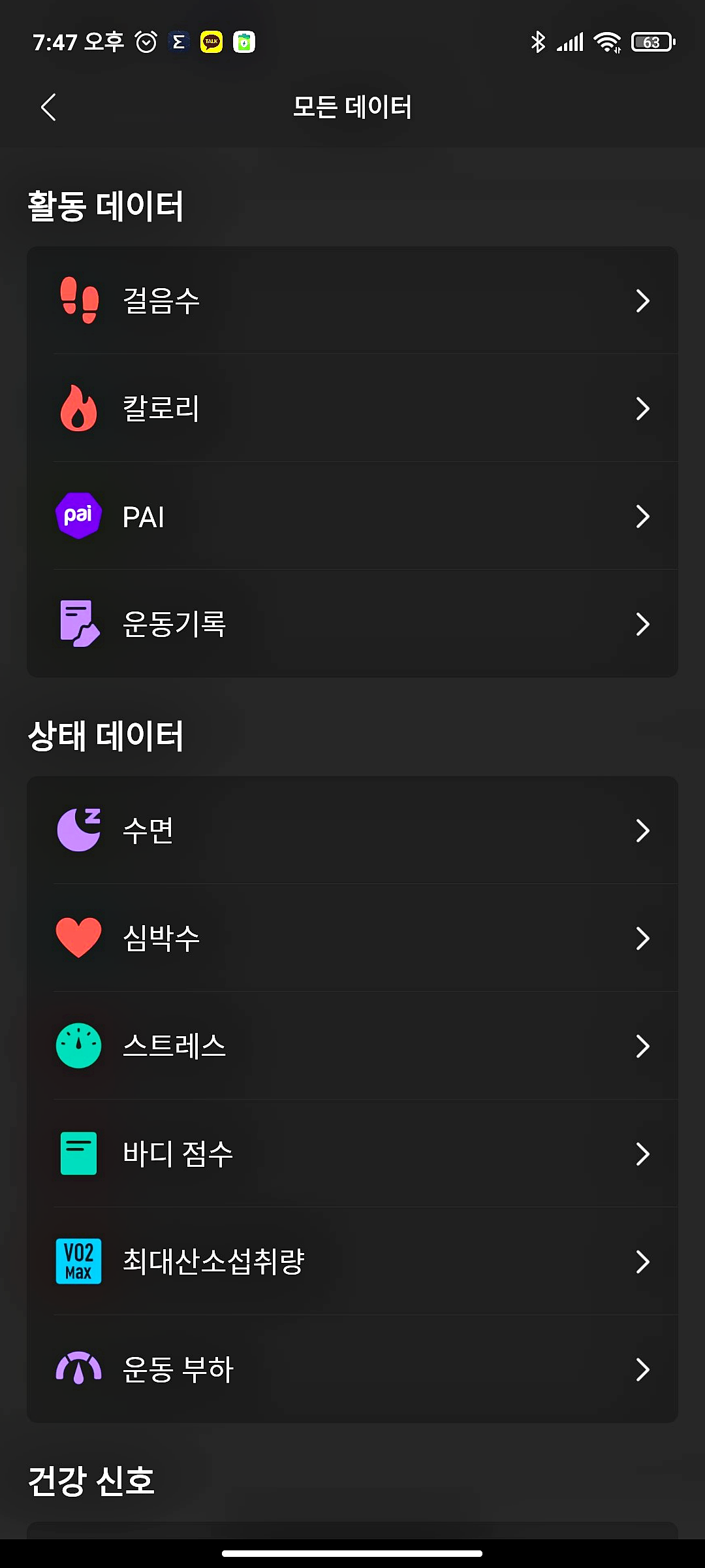 데이터는 하루 만보계, 칼로리, PAI, 운동기록, 수면, 심박수, 스트레스, 등등의 알 수 있으며 그 외 인바디 등을 연동하면 신체 정보도 알 수 있습니다.