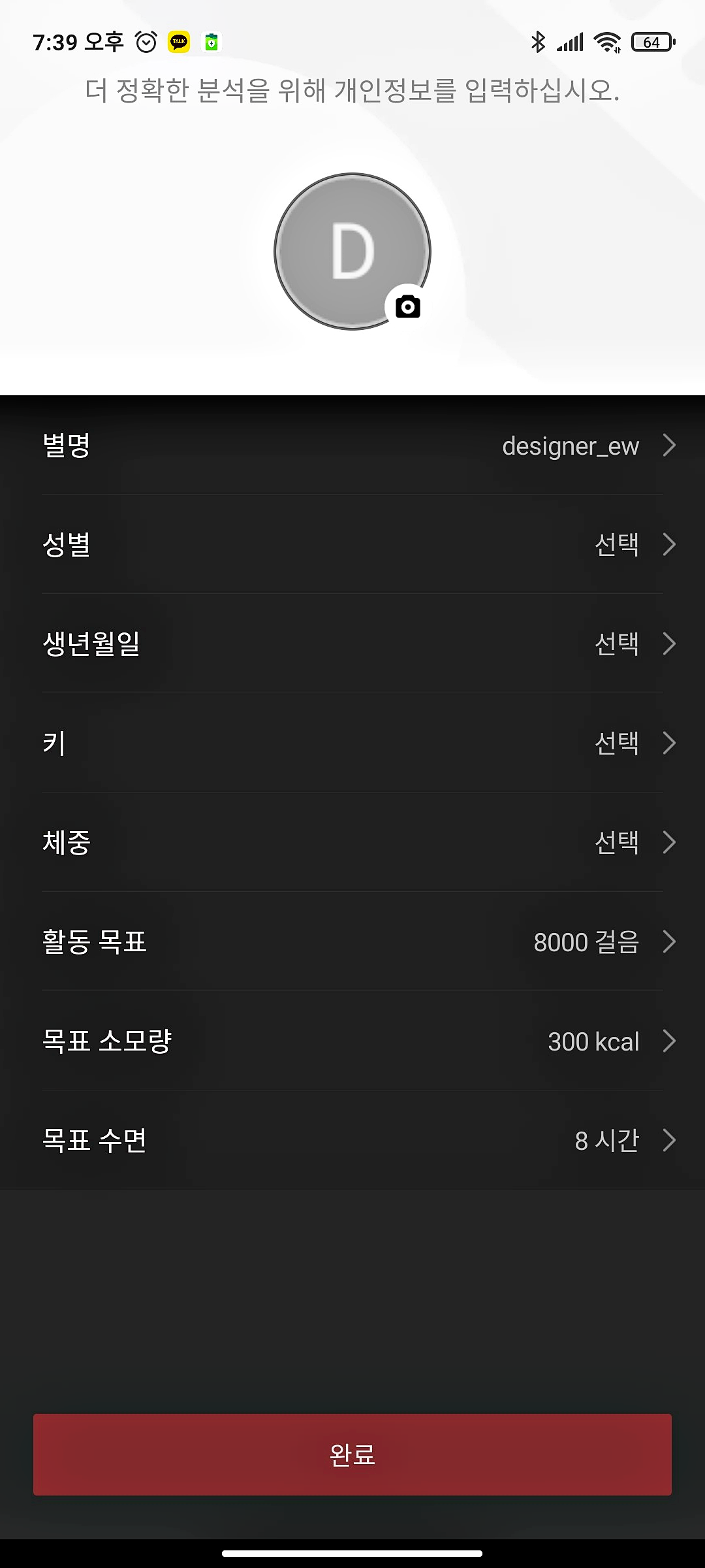 샤오미 계정에 가입 후 성별과 키, 체중, 하루 목표치와 수면시간 등 기본정보를 입력합니다.