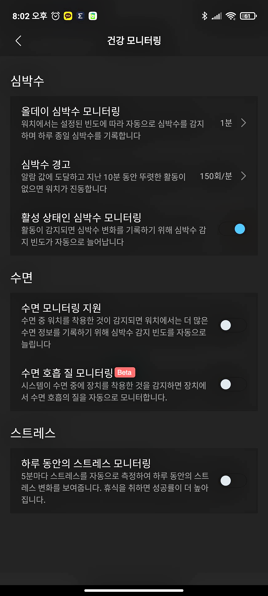 건강모니터링에서는 심박수와 수면, 스트레스를 측정할 수 있습니다.