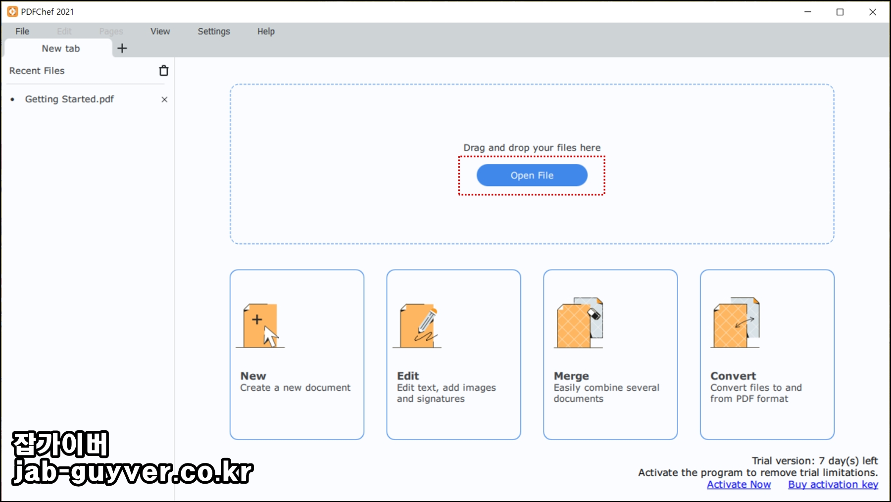 Open File을 통해 수정하고자 하는 pdf파일을 불러오거나 마우스로 드래그해서 가져올 수 있습니다.