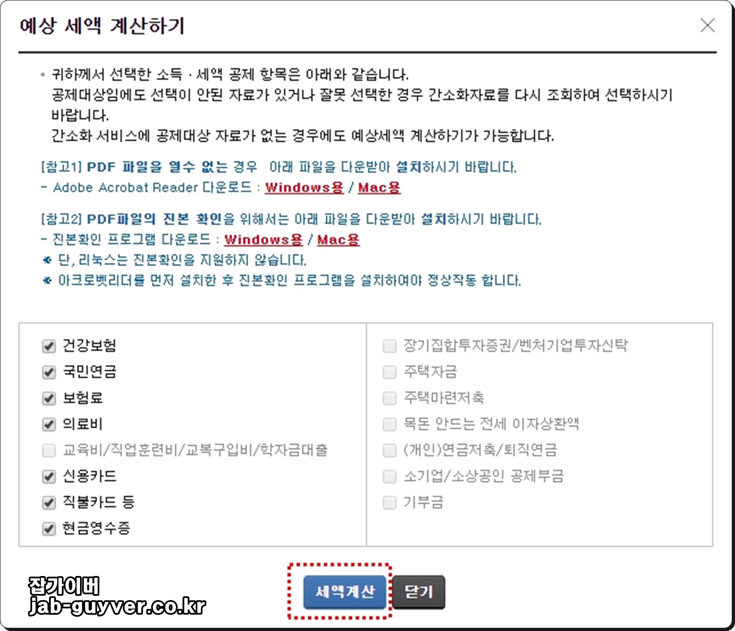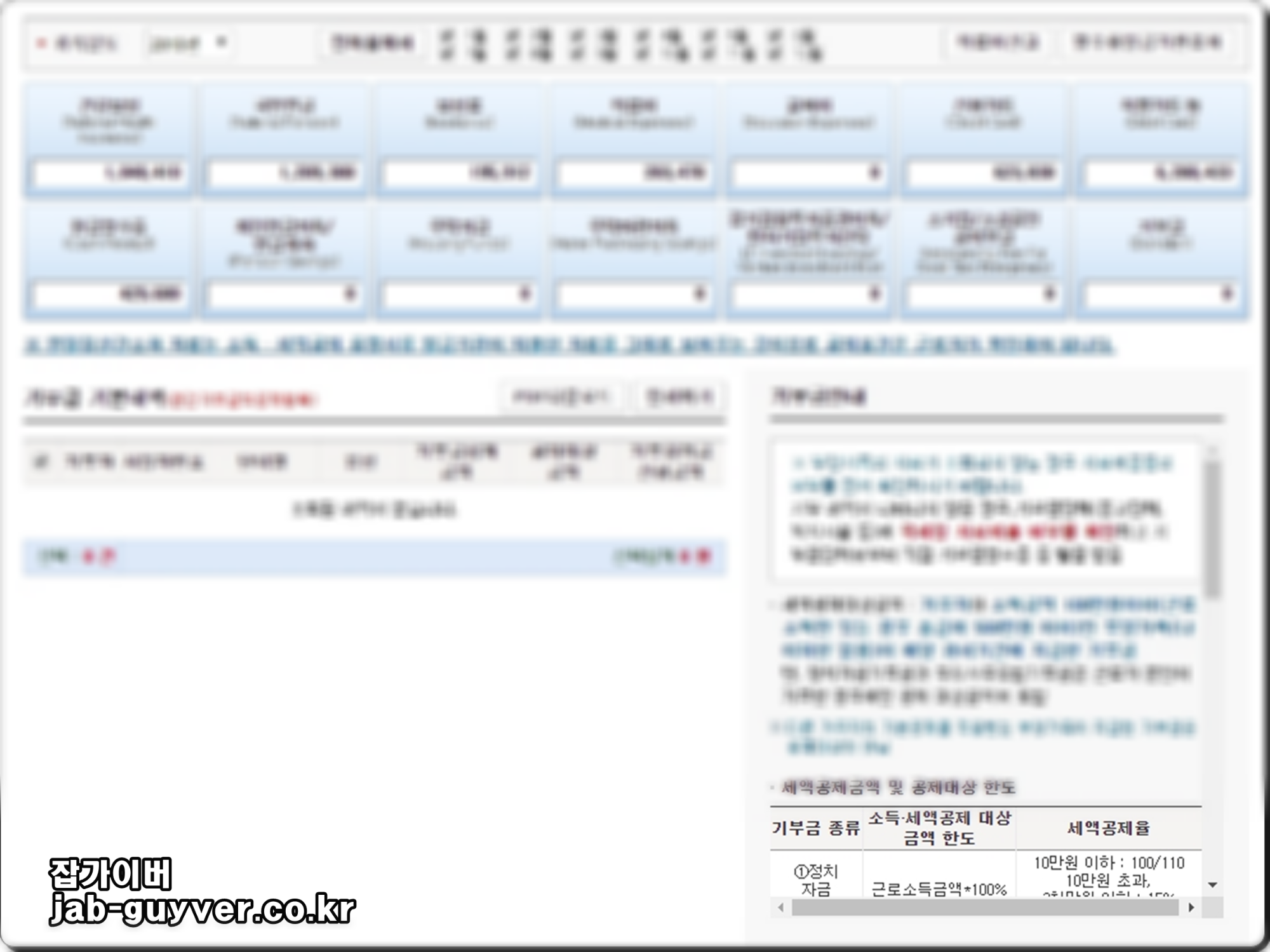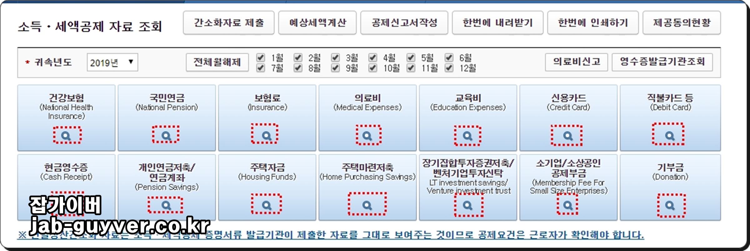 건강보험, 국민연금, 보험료, 의료비, 교육비, 신용카드, 직불카드, 현금영수증, 개인연금저축, 연금계좌, 주택자금, 주택마련 저축, 기부금 등등 돋보기를 하나씩 클릭합니다.