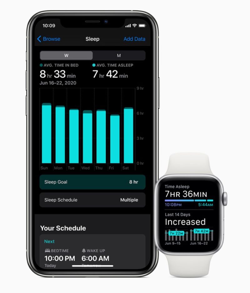 watchOS 7을 통해 Apple Watch는 수면 추적 기능을 도입하여 사용자가 원하는 수면량을 얻고, 제시간에 잠자리에 들며, 수면 목표를 달성하기 위한 취침 전 루틴을 만드는 데 유용한 도구를 제공함으로써 수면에 대한 전체적인 접근 방식을 취합니다. 수면 중 호흡 신호를 보내는 시계 가속도계의 미세한 움직임 감지를 통해 Apple Watch는 착용자가 잠자는 시간과 매일 밤 잠을 얼마나 잘 수 있는지 지능적으로 캡처합니다. 아침에 착용자는 깨어있는 시간과 수면 시간을 포함하여 전날 밤 수면의 시각화를 볼 수 있습니다. 또한 주간 수면 추세를 보여주는 차트가 표시됩니다.