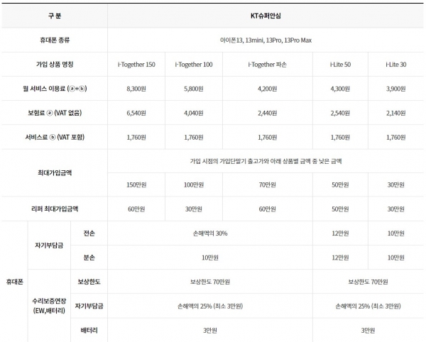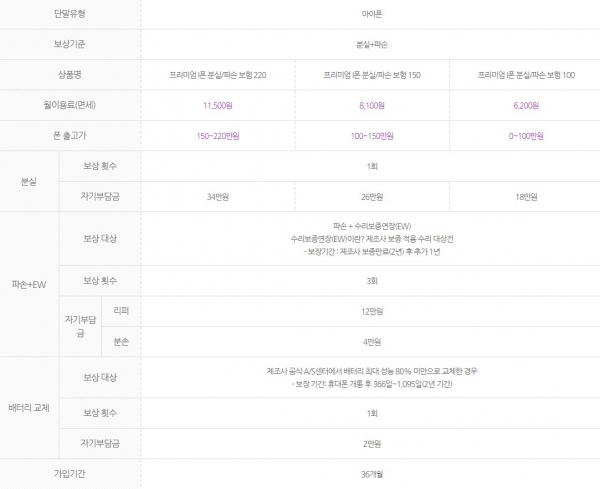 | 자기부담금 | 액정 파손시 4만원 기타 파손 리퍼 12만원 |