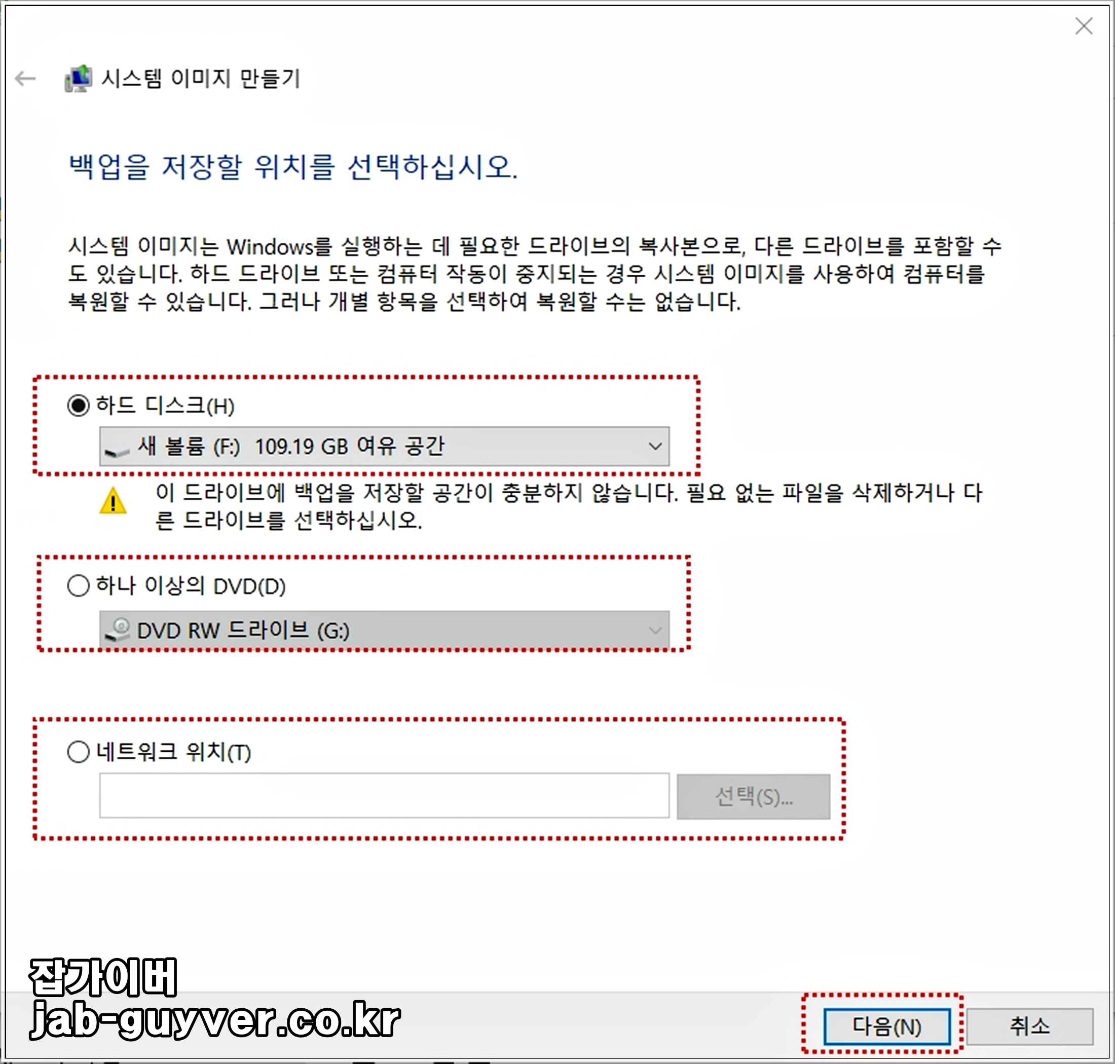 백업하고자 하는 드라이브 및 DVD RW를 선택할 수 있으며 네트워크에 저장도 가능합니다.
