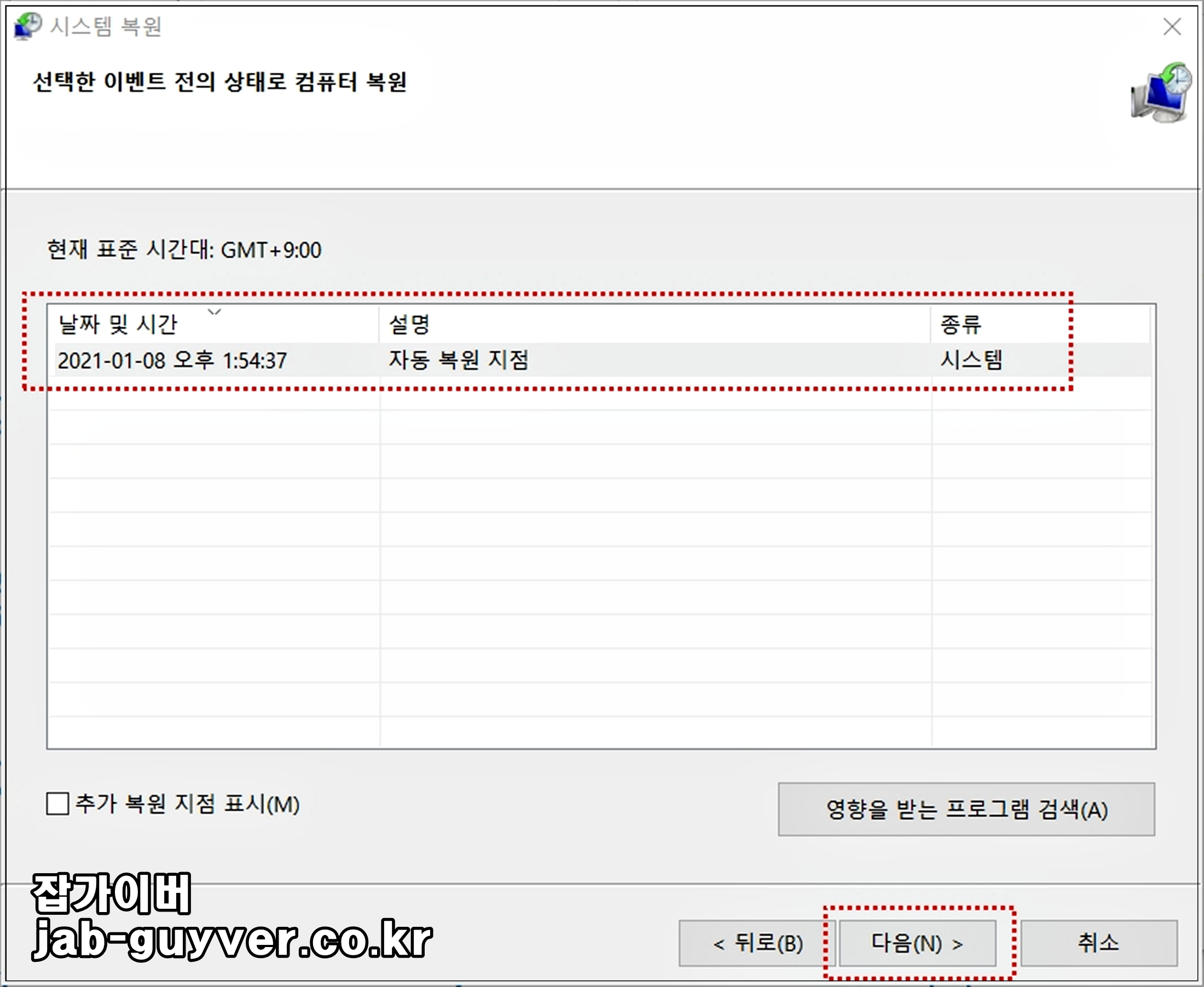 모든 내용을 확인했다면 복원지점으로 윈도우10 복구 진행합니다.