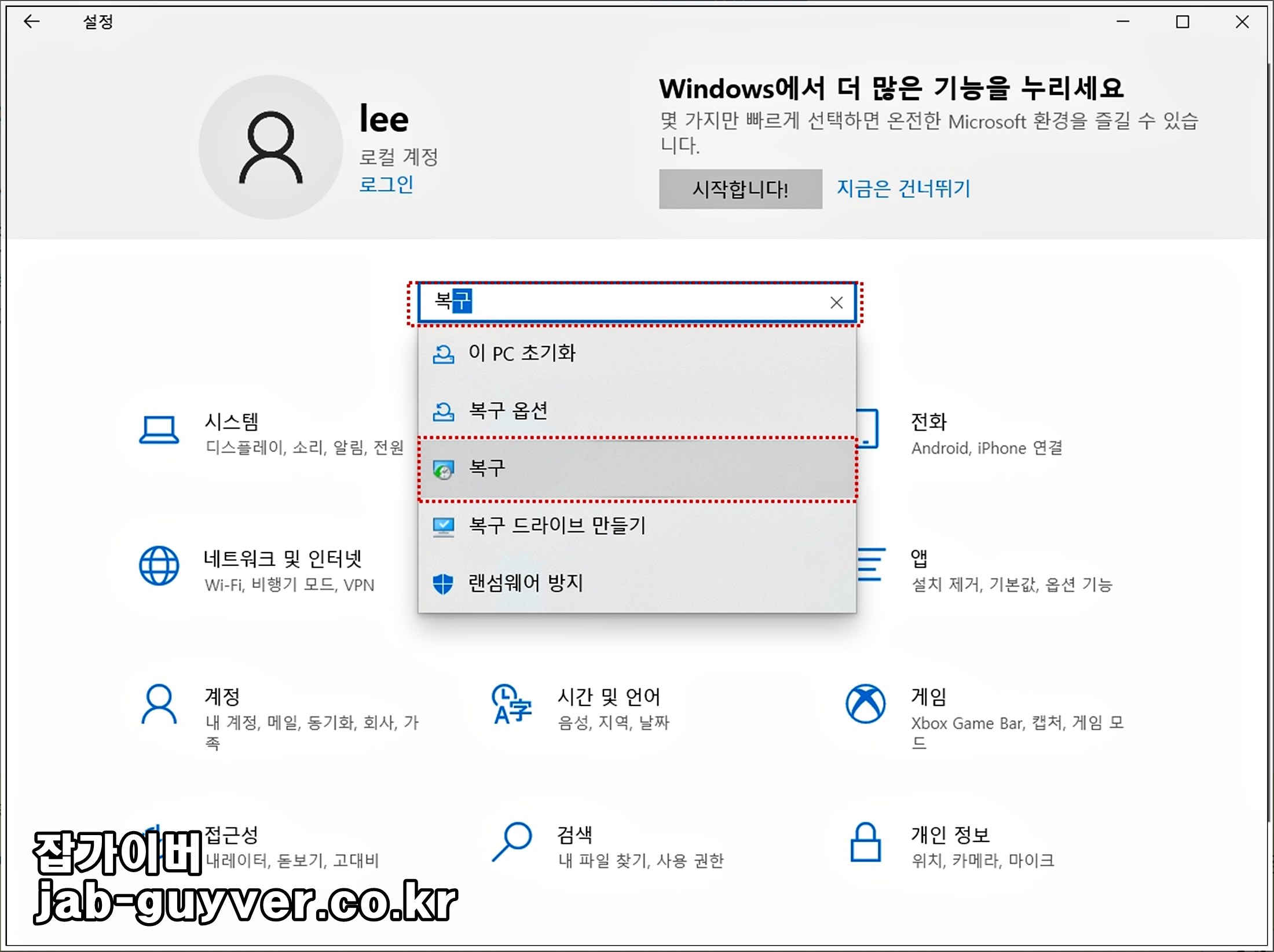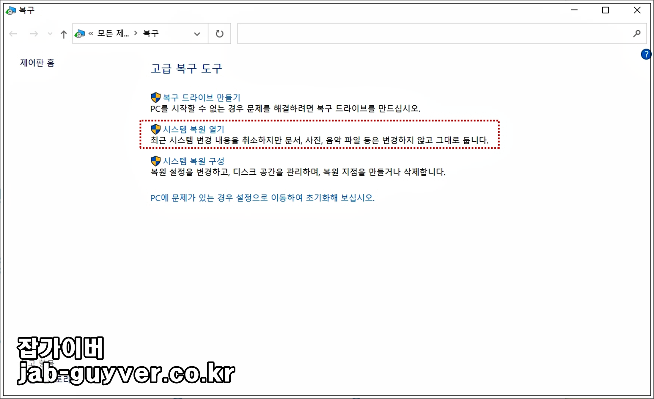 검색부분에 복구를 선택합니다.