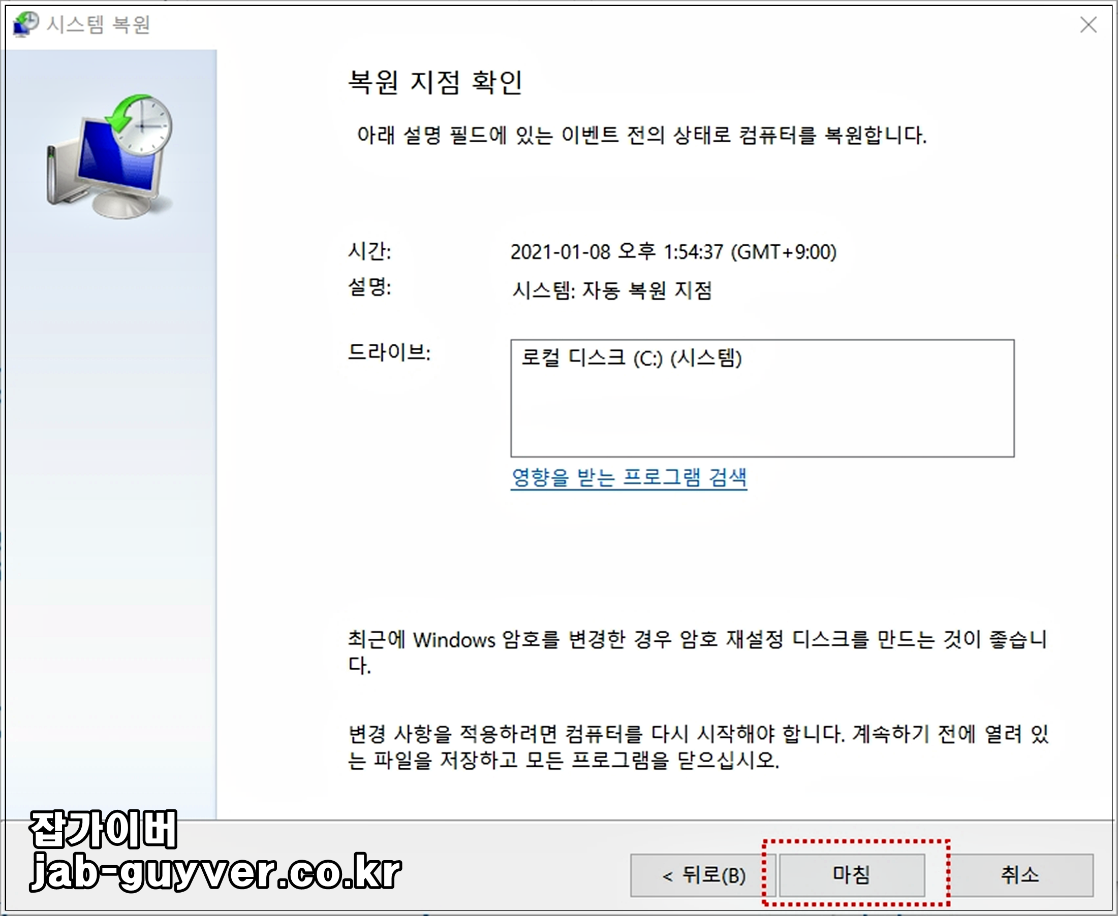 모든 내용을 확인했다면 복원지점으로 윈도우10 복구 진행합니다.