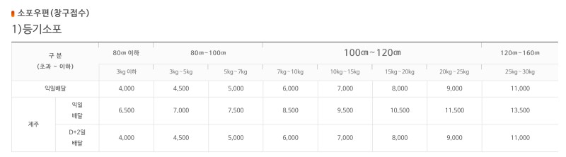 | 기타 | 포장하기 곤란하거나 타우편물에 피해를 줄 수 있는 제품이거나 상품가격이 300만원 초과하는 물품 |