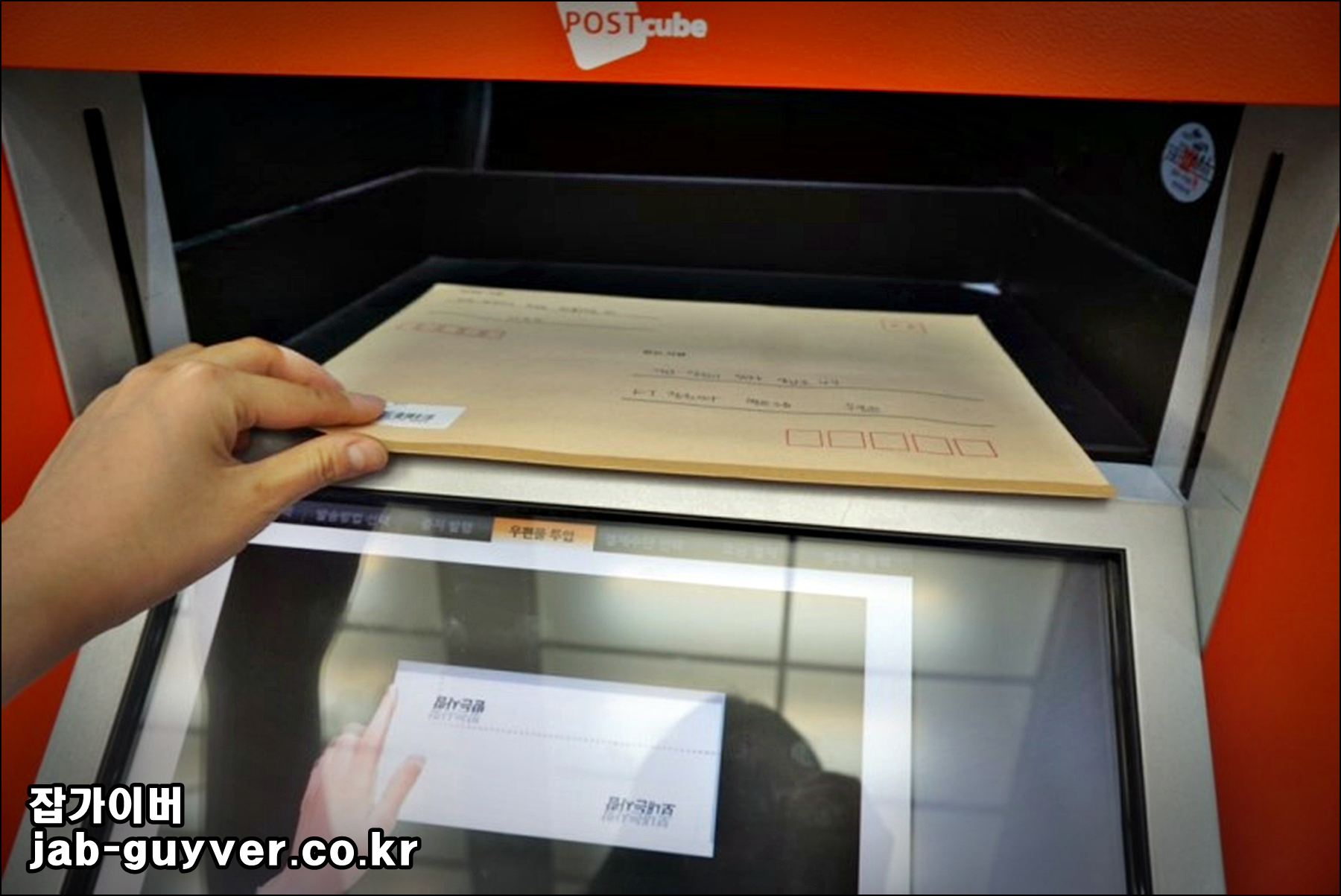 서류봉투에 스티커를 붙히고 우편번호와 주소등을 기입하여 무인 우편창구 시스템에 넣어줍니다.