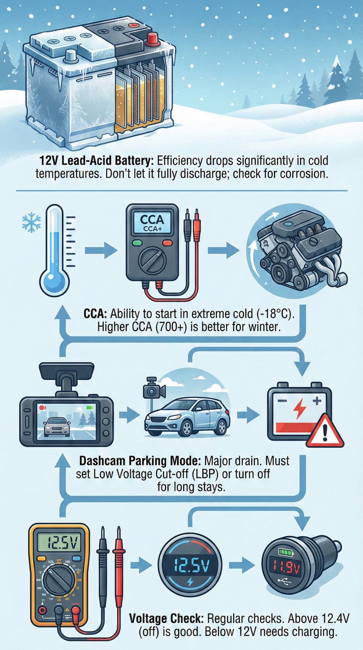 영하권에서 야외 주차가 길어지면 시동 순간 전압 강하가 두드러지고, 짧은 거리를 자주 움직이면 충전 시간이 모자라 만성 방전 상태로 들어가기 쉽다.
