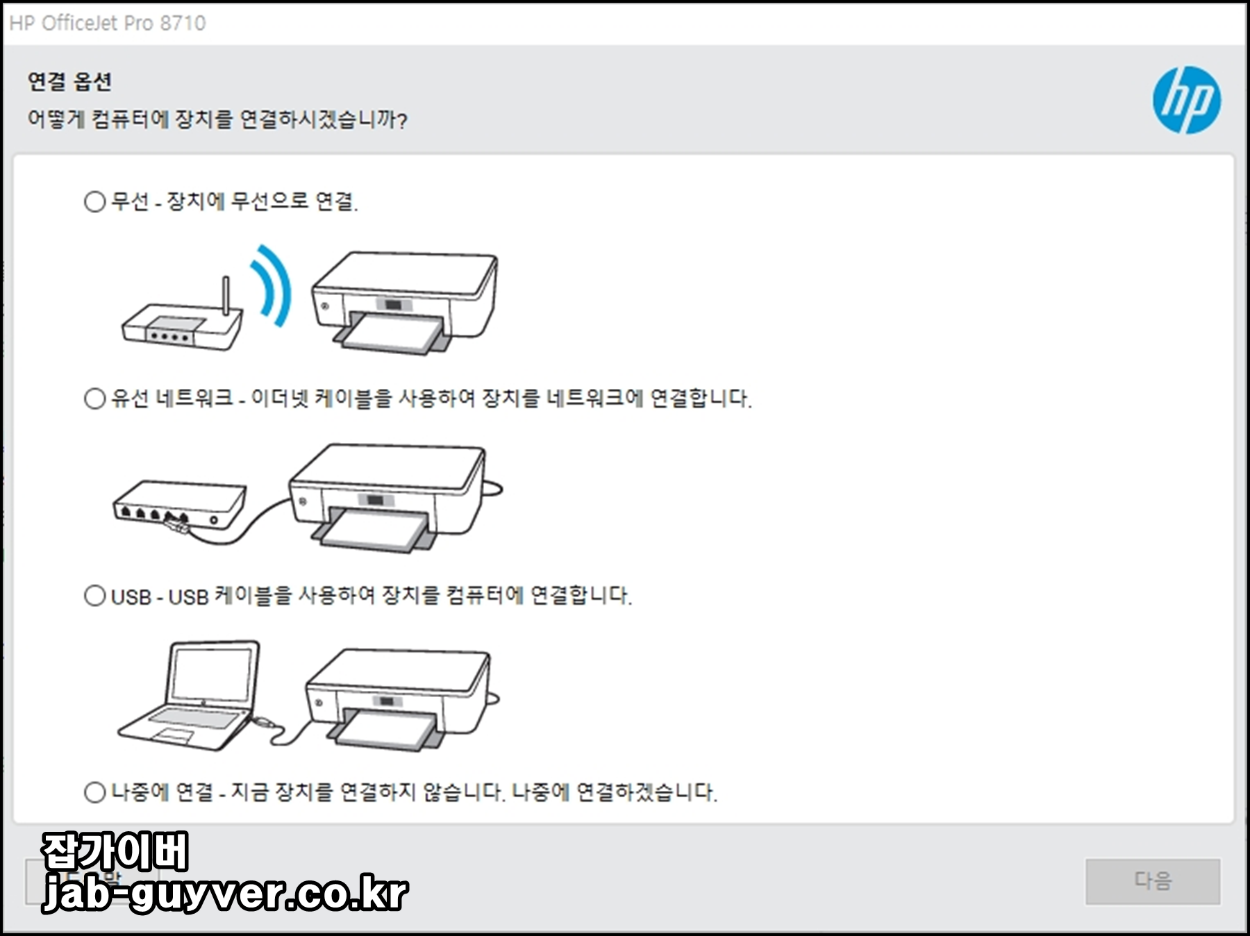 - 나중에 연결 - 지금 장치를 연결하지 않고 우선 프린터 드라이브부터 설치합니다.