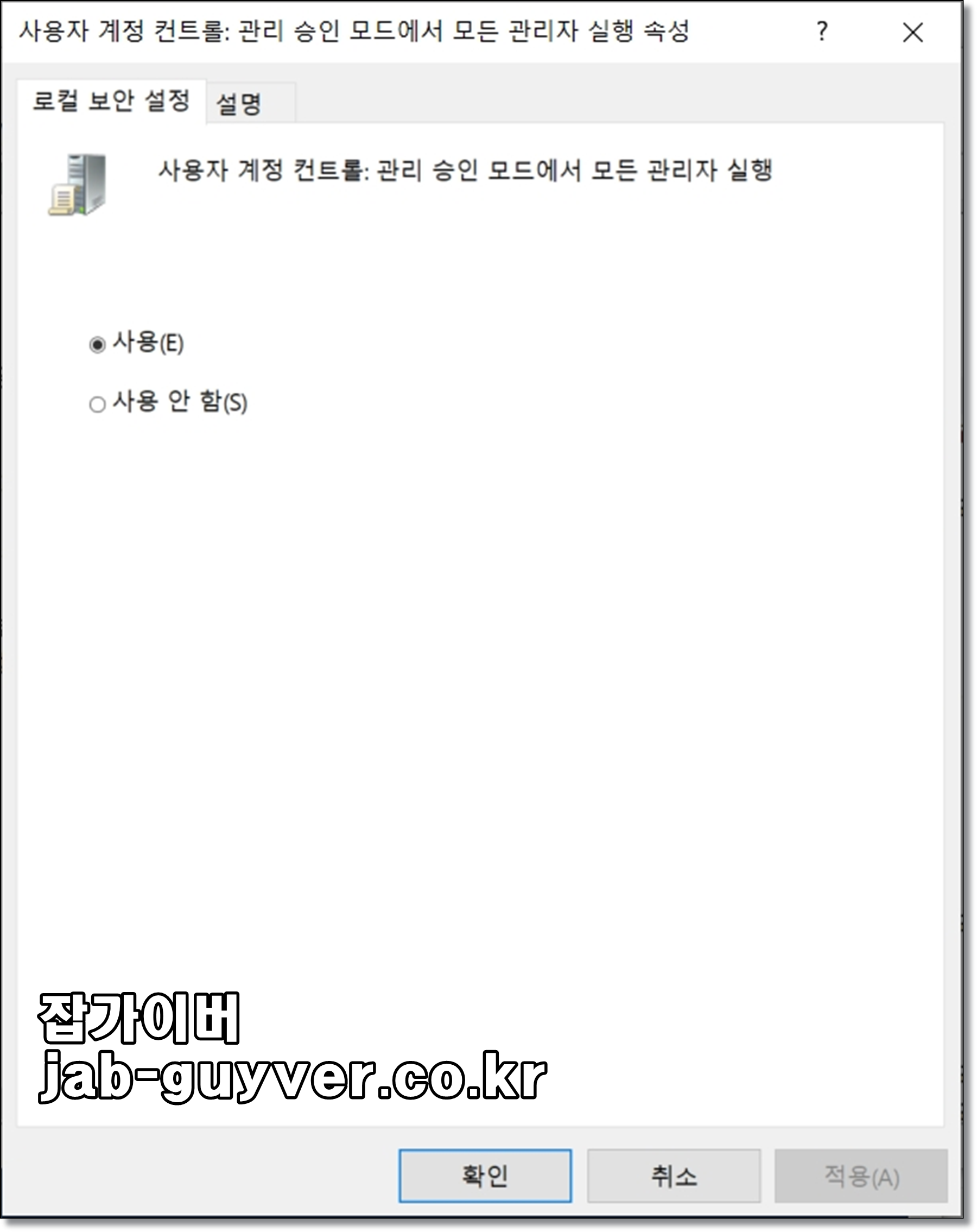 사용자 계정 컨트롤 : 관리 승인모드에서 모든 관리자 항목을 사용에서 사용 안함으로 변경 후 확인을 눌러줍니다.