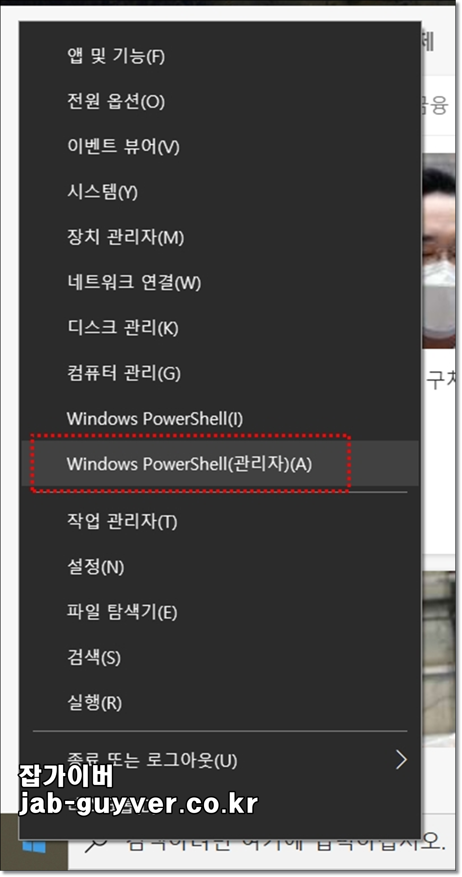 윈도우 로고 우클릭 후 파워쉘 Windows PowerShell 관리자모드로 실행합니다.