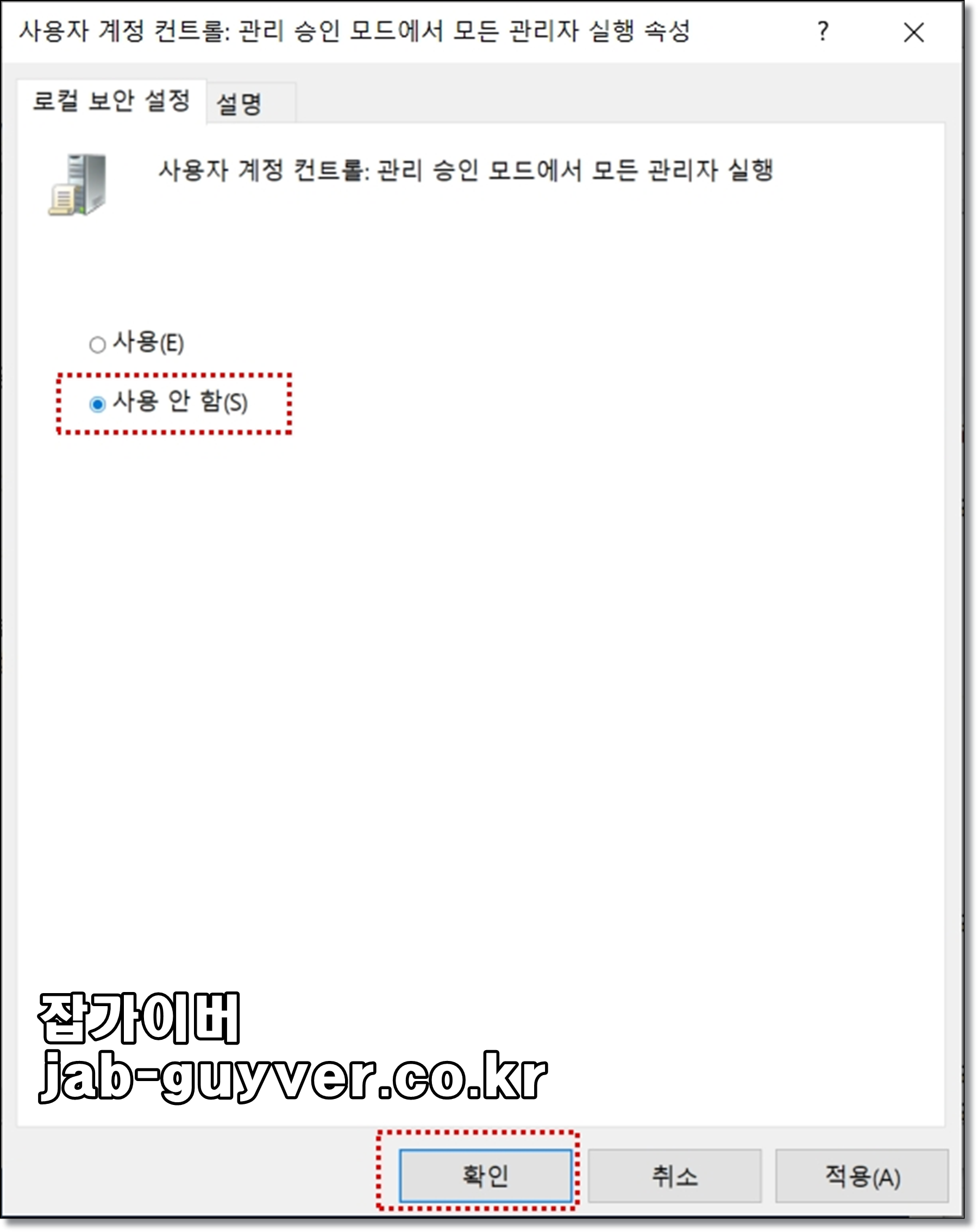 사용자 계정 컨트롤 : 관리 승인모드에서 모든 관리자 항목을 사용에서 사용 안함으로 변경 후 확인을 눌러줍니다.