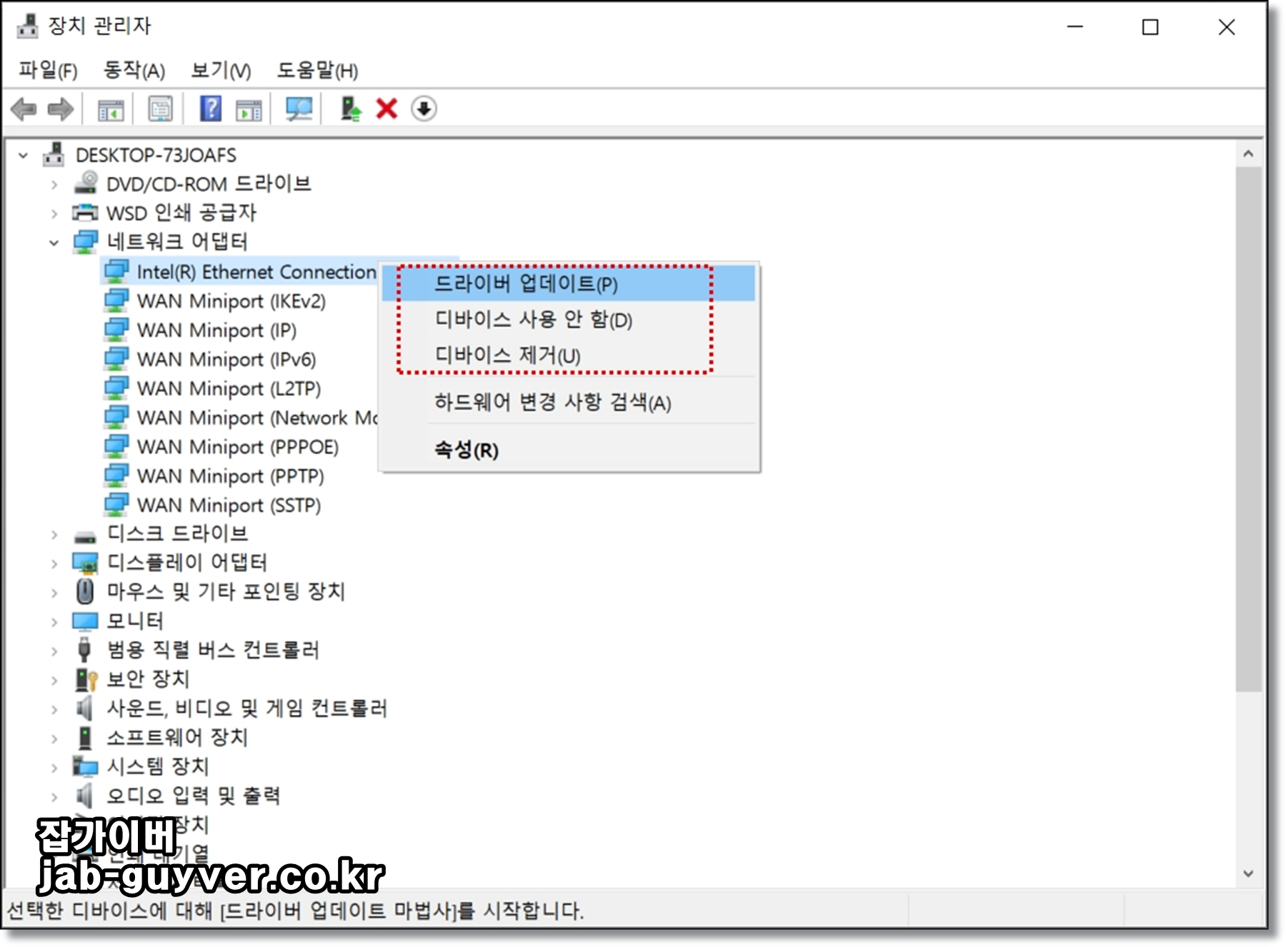 그리고 드라이브가 잘못 설치되었거나 문제가 발생했다면 디바이스 제거 및 드라이브 업데이트를 진행합니다.