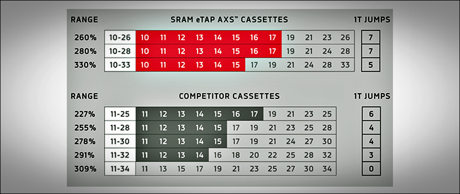 카세트와 체인링의 큰 변화로 인해 스램은 기존의 전통적인 기어비보다 더욱 폭넓은 기어비를 활용할 수 있게 되었으며 Sram은 이러한 독특한 기어비를 X-RANGE™ GEARING라고 이름 지었으며 이탭 액세스는 X-RANGE™로 인해 도로 사이클뿐만 아니라 그래블 등 다양한 자전거에 사용할 수 있게 되었습니다.