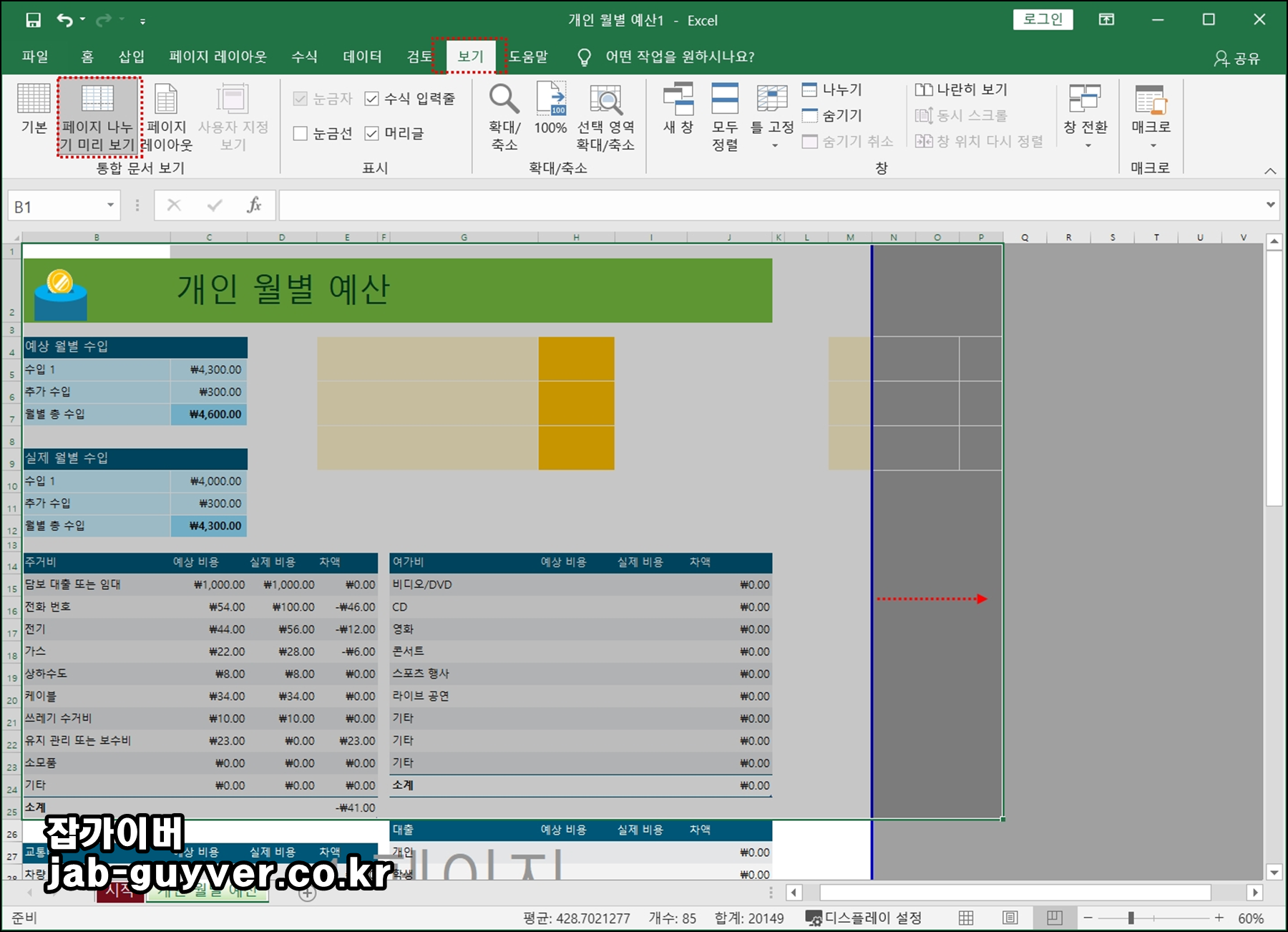 엑셀에는 페이지나누기라는 기능이 있는데 엑셀로 프린터 인쇄를 하는경우 인쇄영역이 잘려 나오느경우가 있습니다.