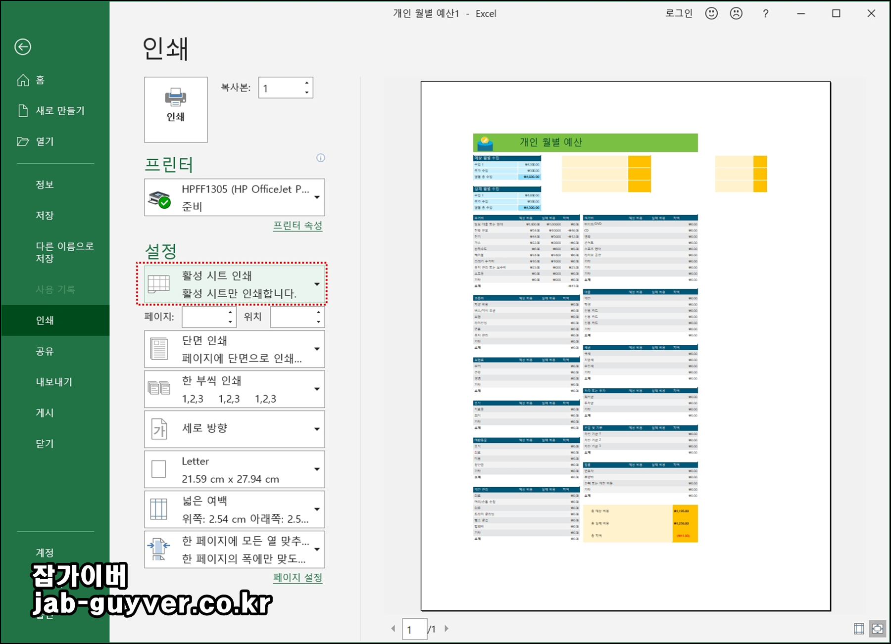 그리고 출력시 설정 -> 선택 영역 인쇄로 변경하는 방법도 있습니다.