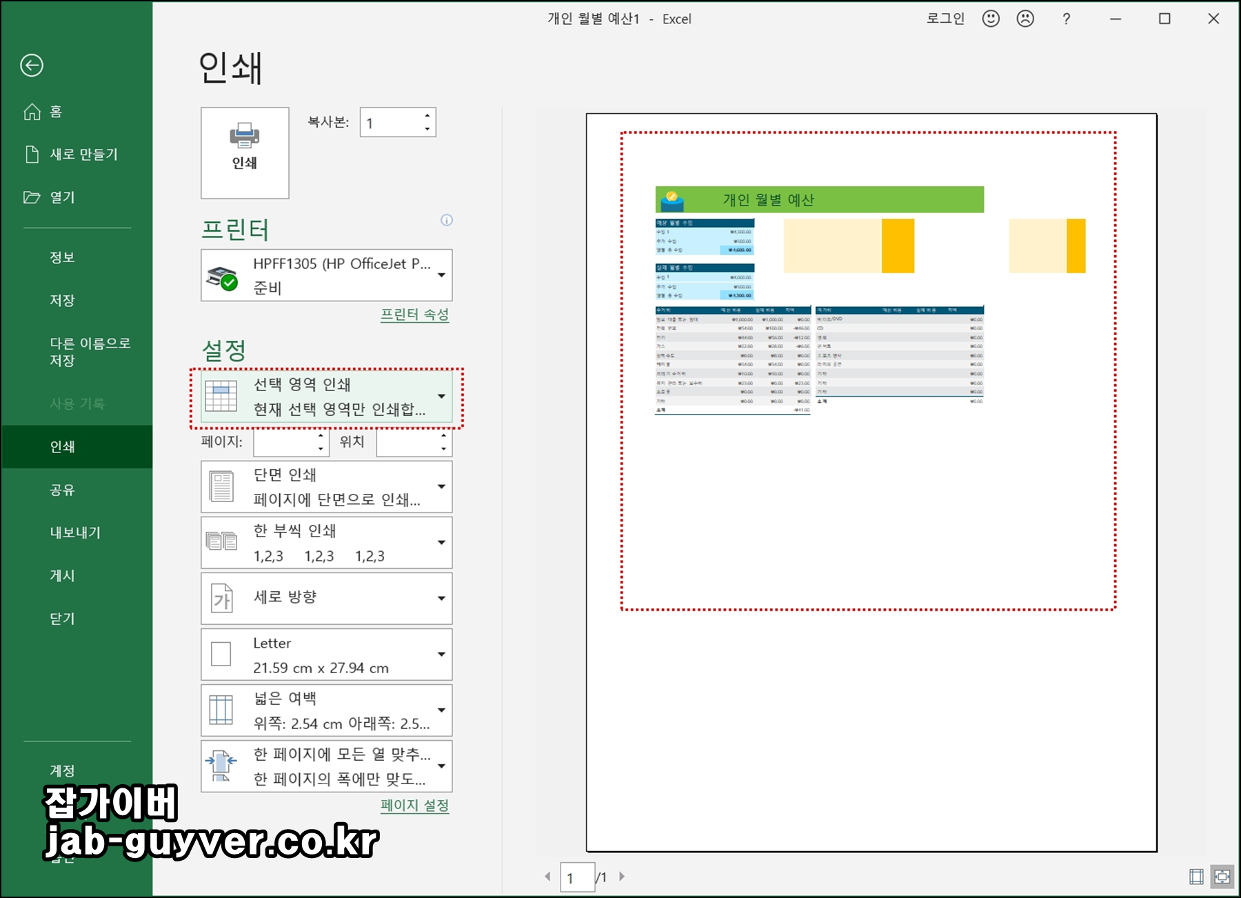 그리고 출력시 설정 -> 선택 영역 인쇄로 변경하는 방법도 있습니다.