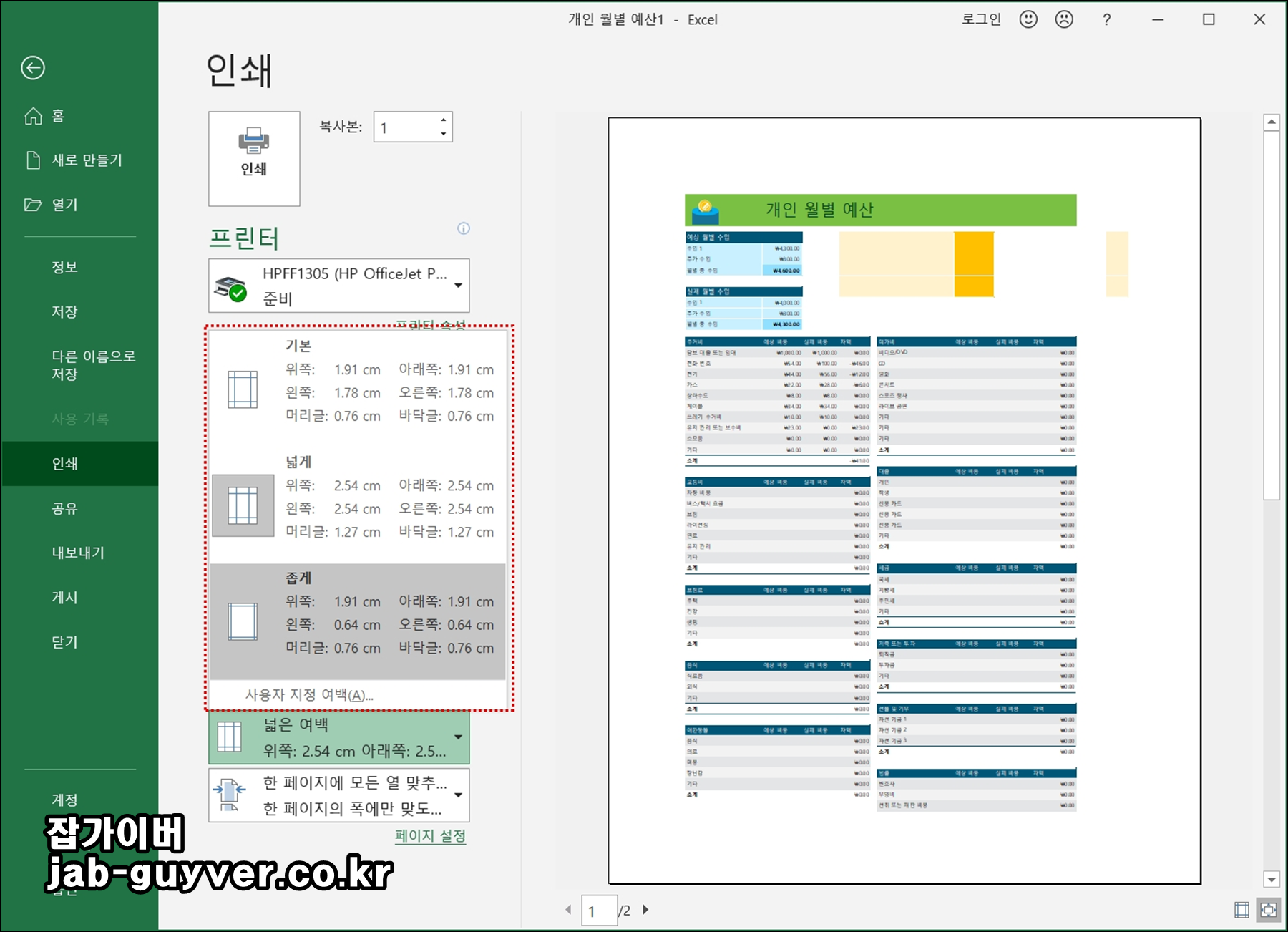엑셀 프린터 인쇄 여백설정