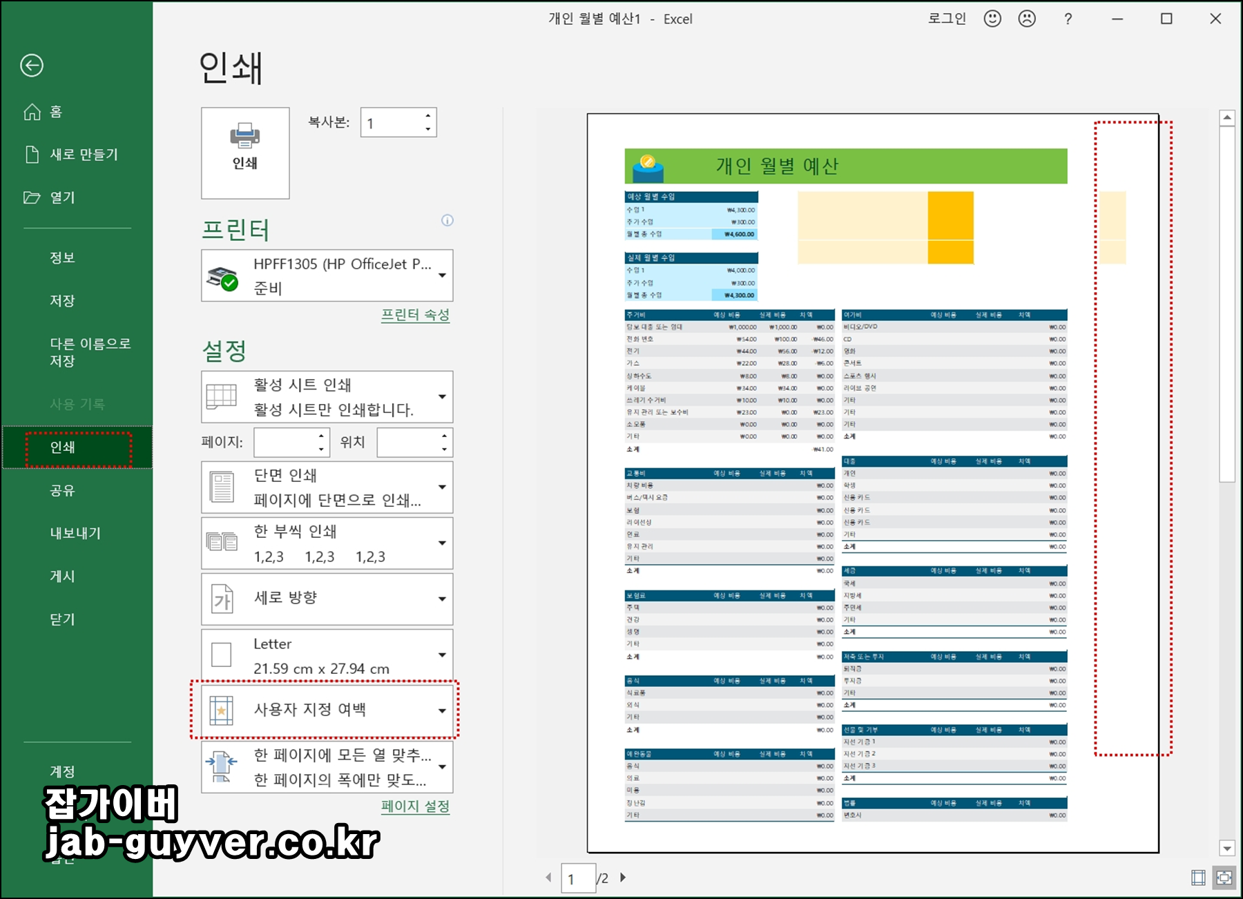 그리고 사용자 지정여백을 통해 여백을 넓게나 좁게 설정하여 프린터 출력시 잘리느것을 여백으로 해결할 수 있습니다.