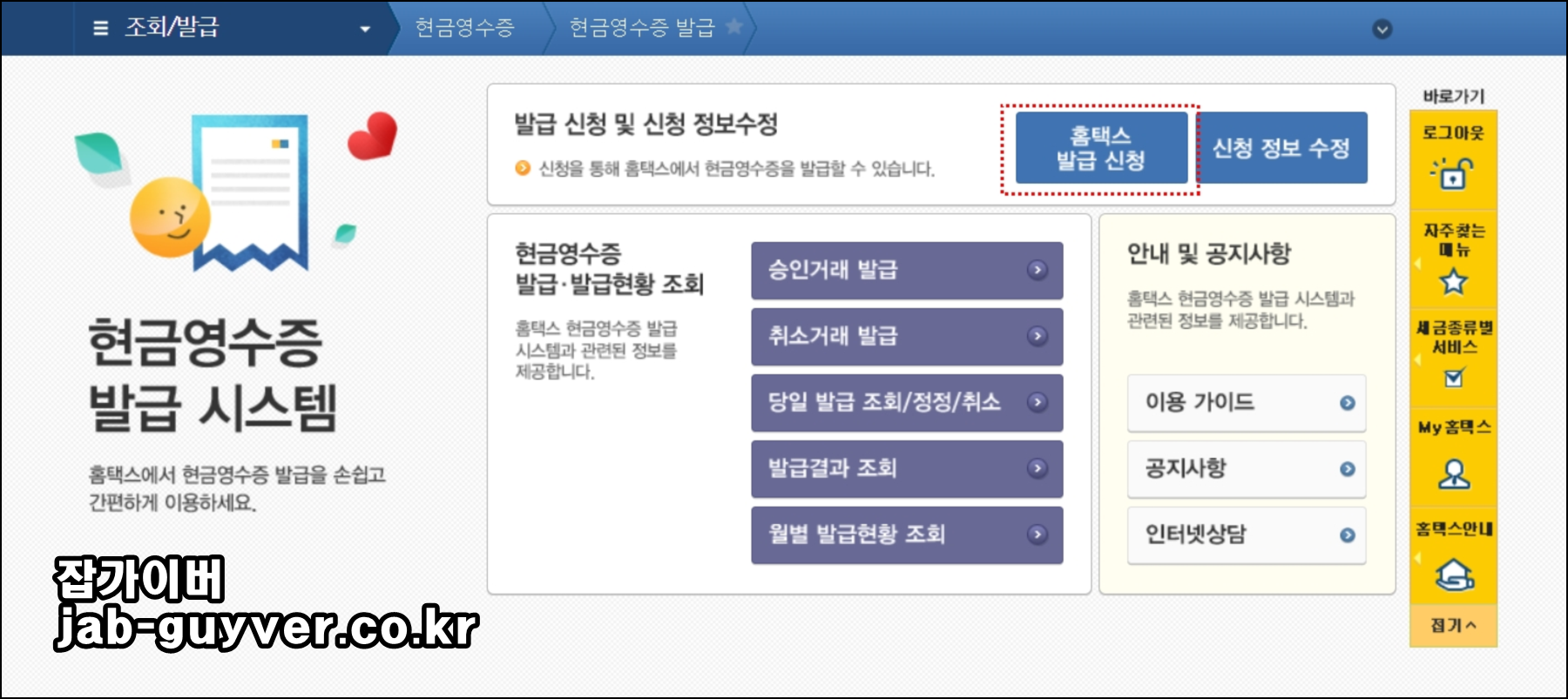 현금영수증 발급 시스템을 통해 홈택스 발급신청을 진행합니다.