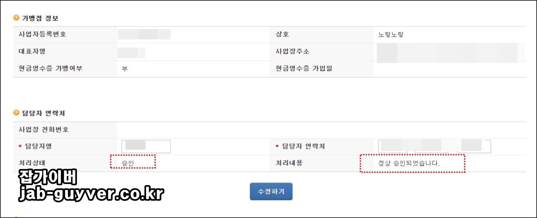 그리고 사업자 상호와 대표자명,사업장주소등을 확인할 수 있으며 현재 현금영수증 가맹여부와 가입일을 확인할 수 있습니다.