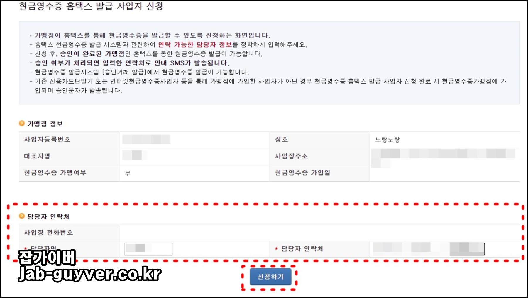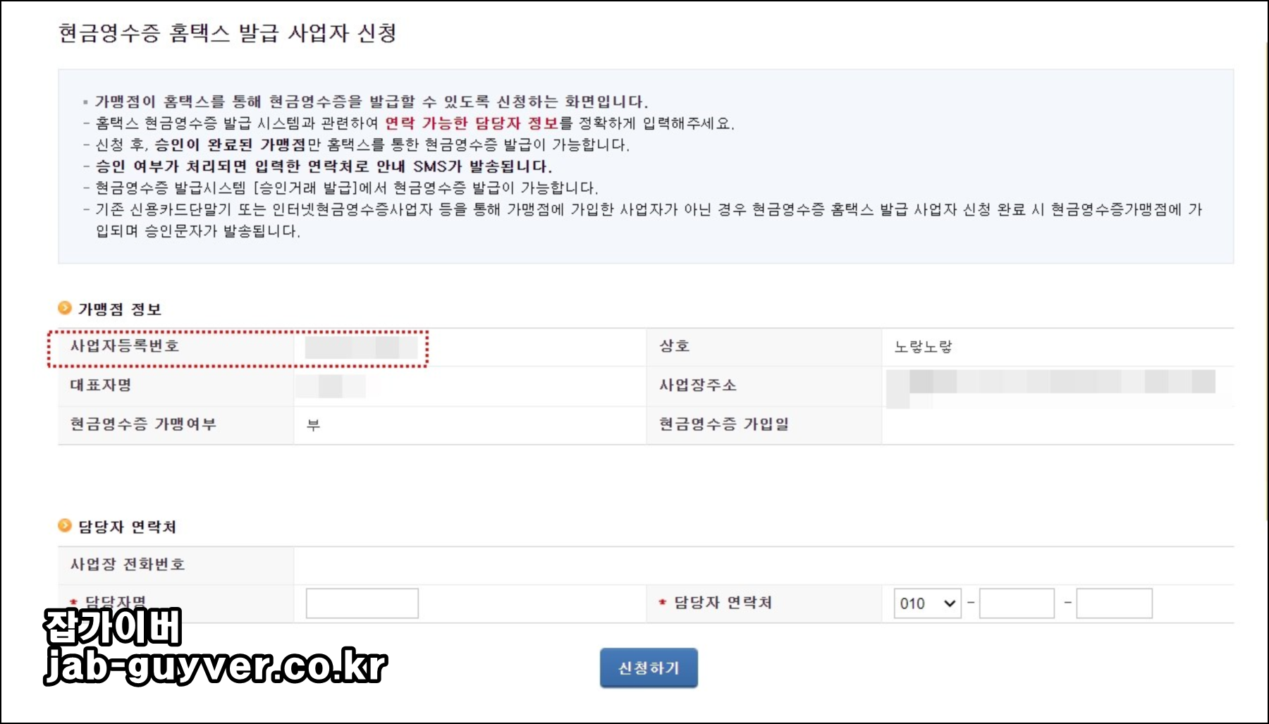 이후 하단의 담당자 연락처에 사업자 전화번호와 이름등을 등록하고 신청하기를 눌러줍니다.