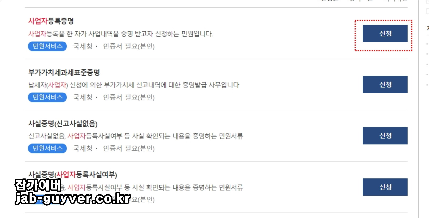 검색창에 사업자로 검색을 하면 사업자등록증명을 신청할 수 있습니다.