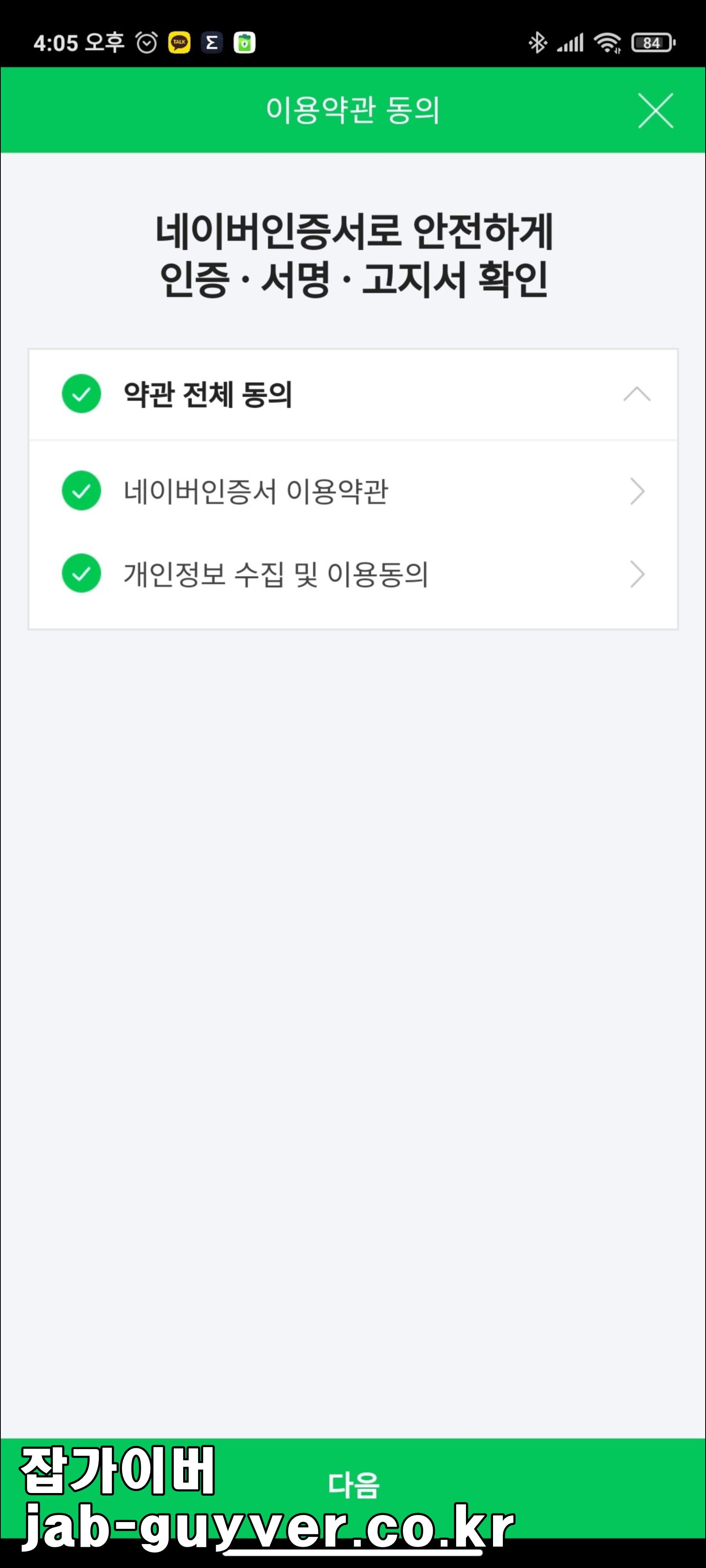 네이버 알림 설정을 활성화 후 네이버 인증서 인증 서명 고지서에 대한 약관에 동의합니다.