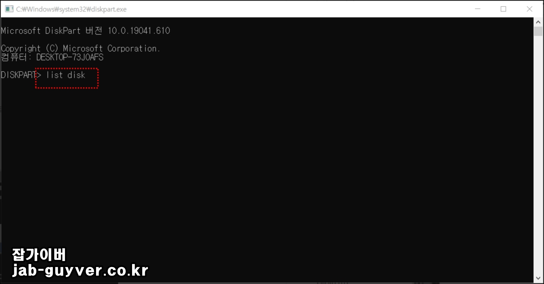 명령 프롬프트에서 diskpart를 입력하여 디스크 관리 도구를 실행 후 list disk 명령을 사용하여 시스템에 연결된 디스크 목록을 표시합니다.