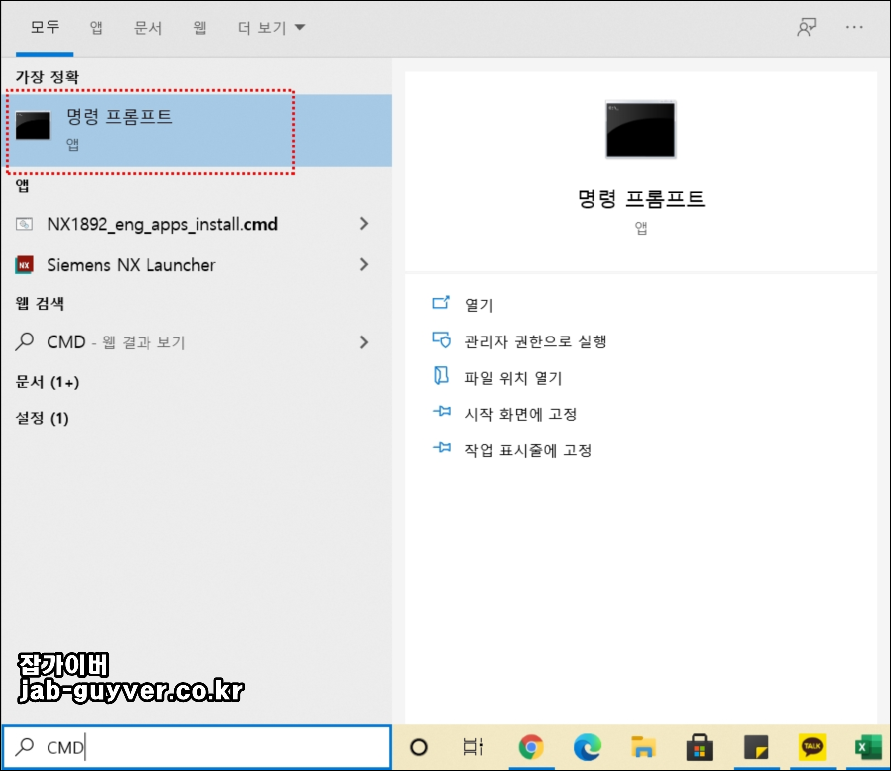 윈도우10 검색창에 CMD를 입력 후 명령 프롬프트 실행합니다.