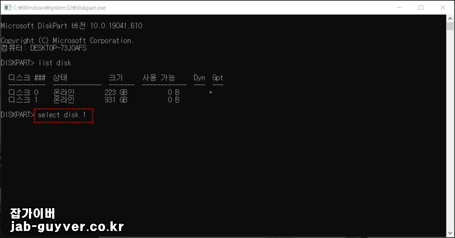 명령 프롬프트에서 diskpart를 입력하여 디스크 관리 도구를 실행 후 list disk 명령을 사용하여 시스템에 연결된 디스크 목록을 표시합니다.