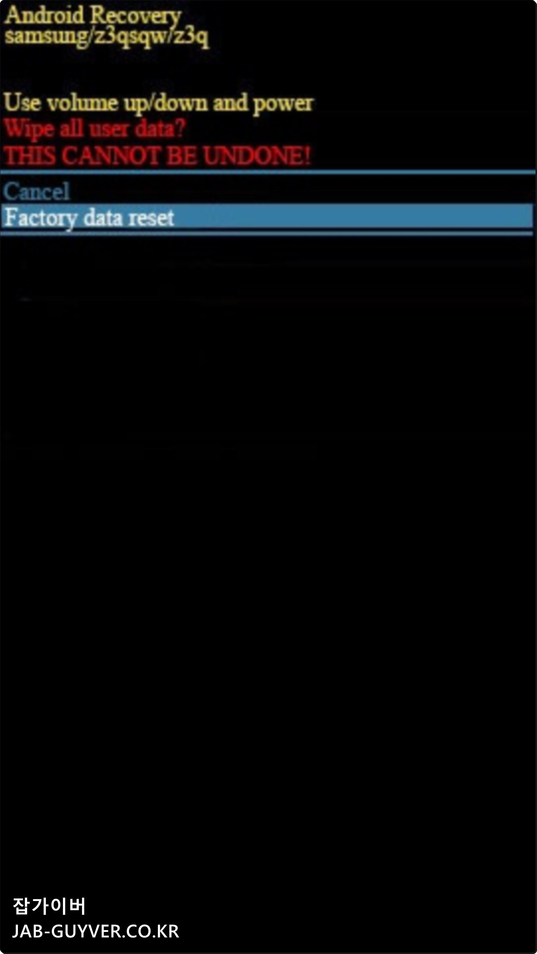 - Wipe Data Factory Reset 선택 후 Yes를 선택하면 모든 데이터가 삭제됩니다.