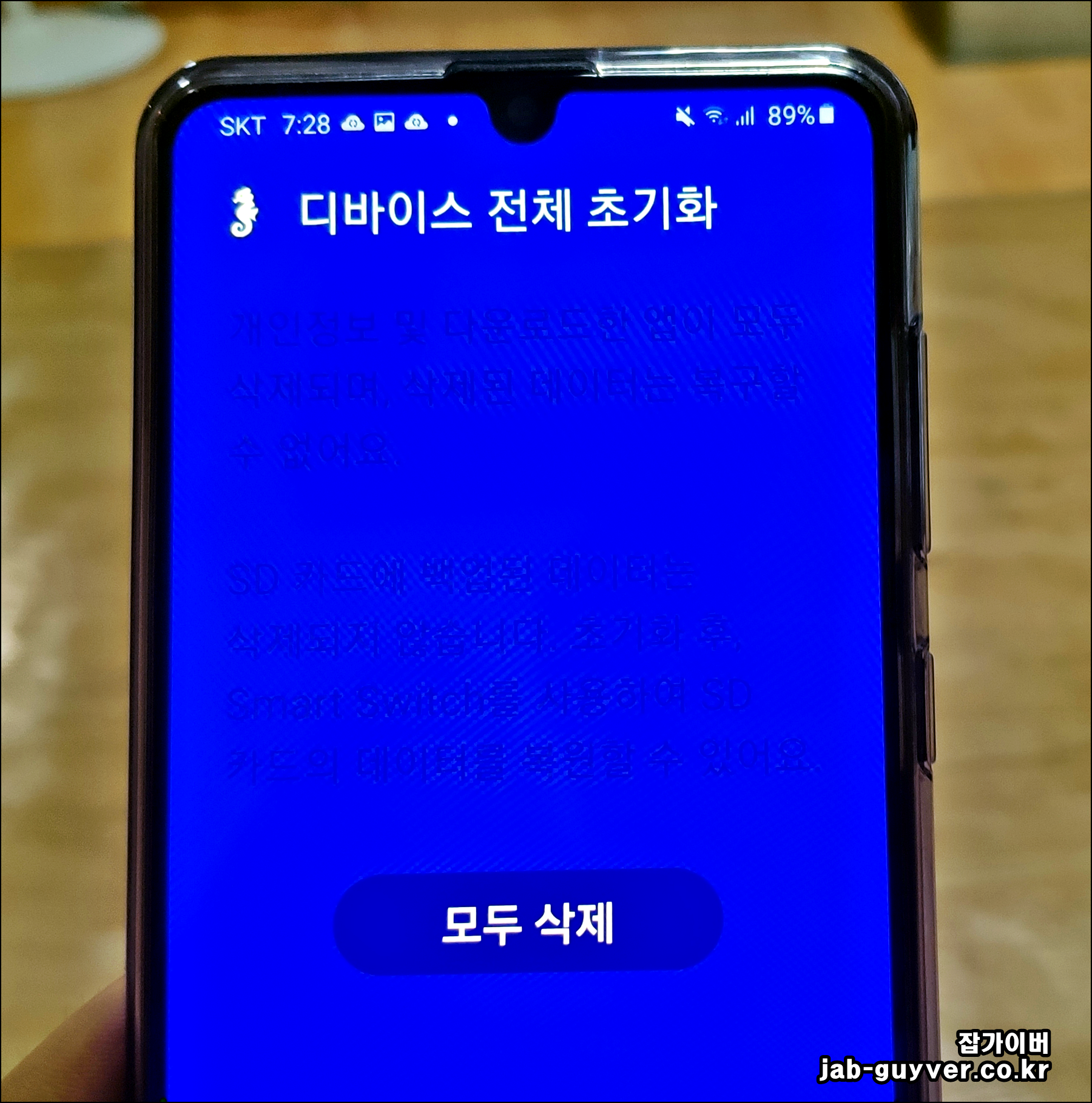 디바이스 전체 초기화에서 모두삭제 버튼을 눌러주면 해당 데이터가 모두 삭제되며 초기화가 완료됩니다.