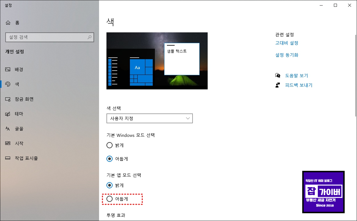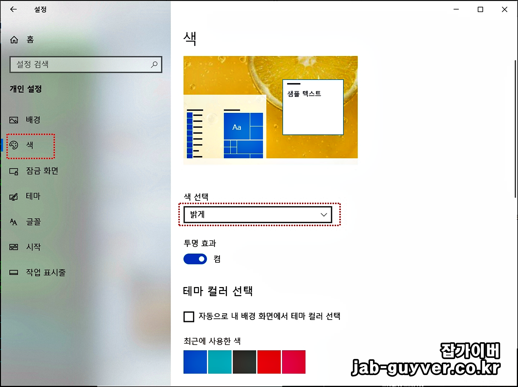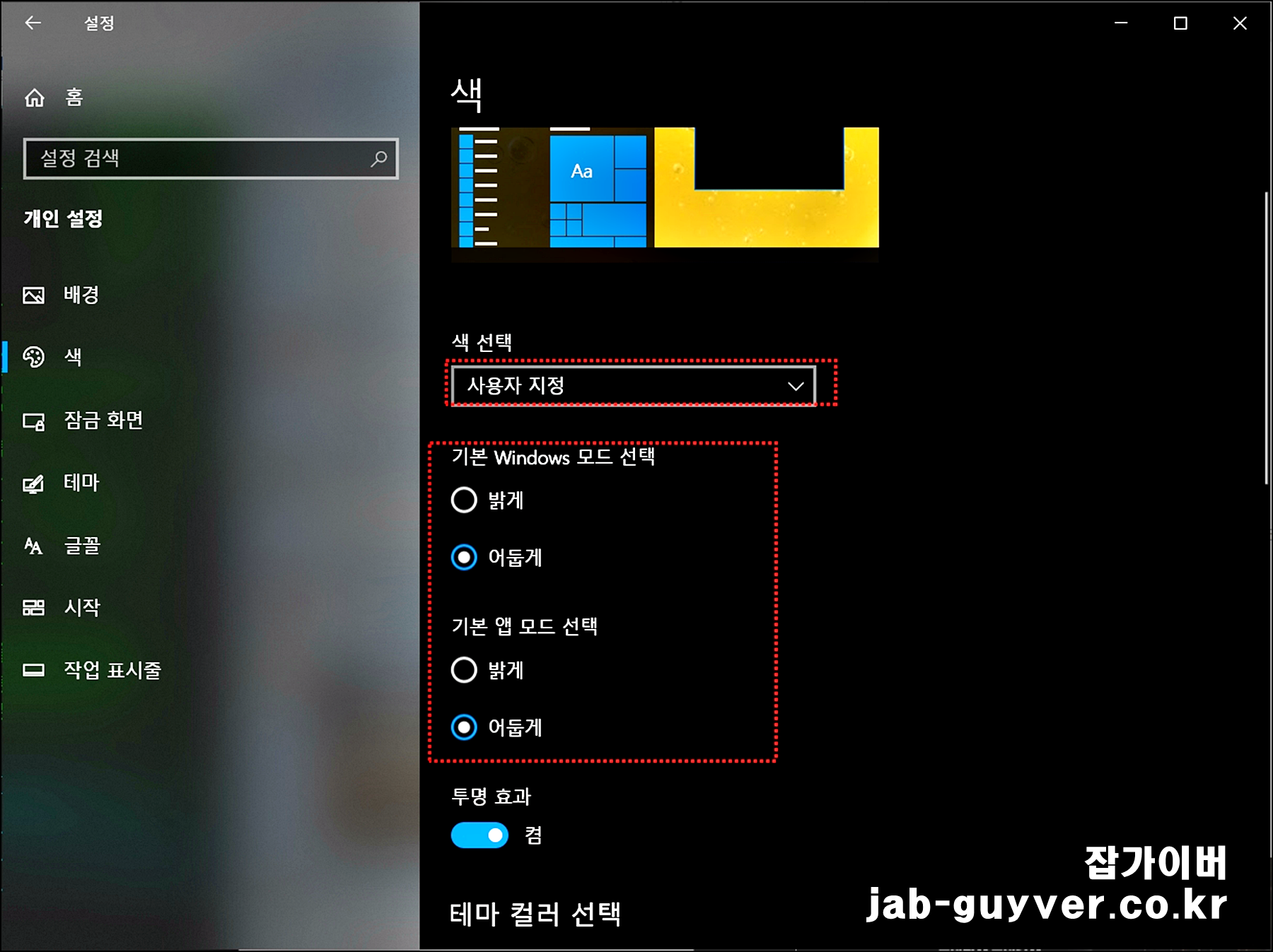 어둡게 색상을 선택하면 전체 테마색상이 어둡게 변하며 투명효과와 함께 테마 컬러를 내 배경화면 색상에 맞게 선택하는것이 가능합니다.