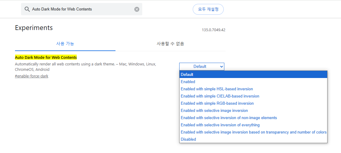 - 'Auto Dark Mode for Web Contents' 항목이 나오면, 오른쪽의 'Default' 버튼을 클릭해 'Enabled'로 변경합니다.