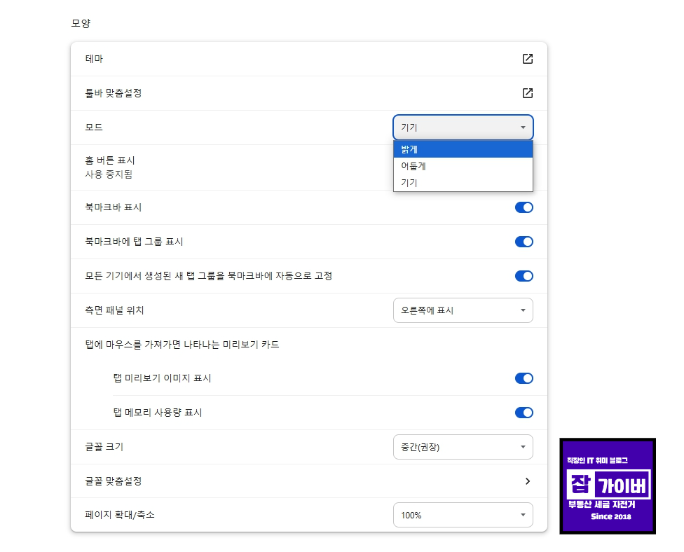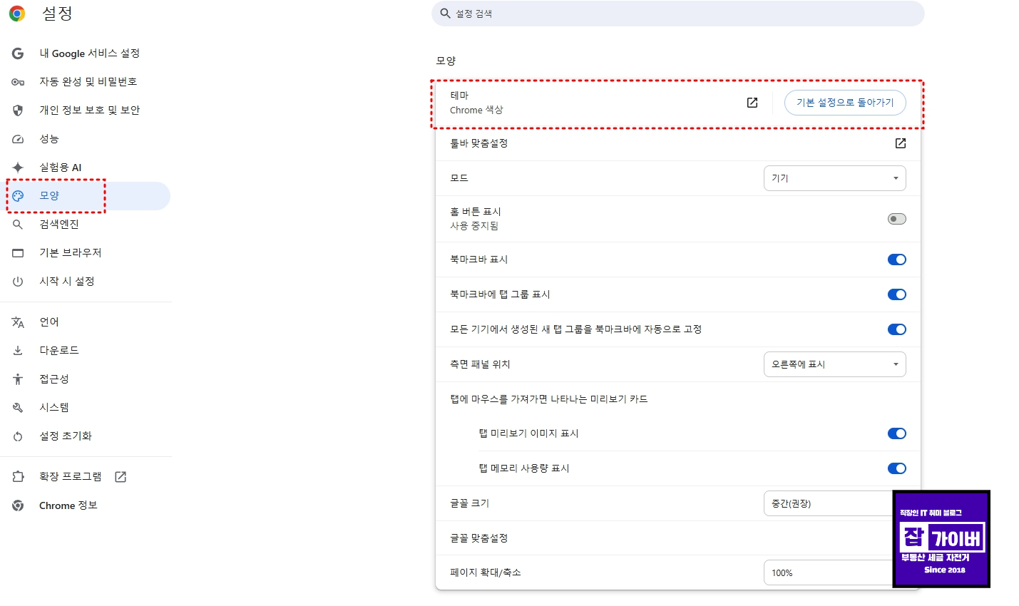 먼저 크롬에서도 설정에 들어가 테마 설정을 초기화하거나 모드를 밝게 어둡게 기기에 맞게 선택할 수 있습닏.