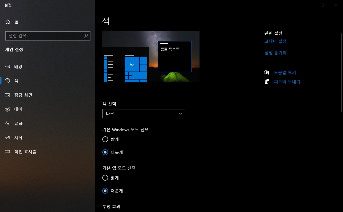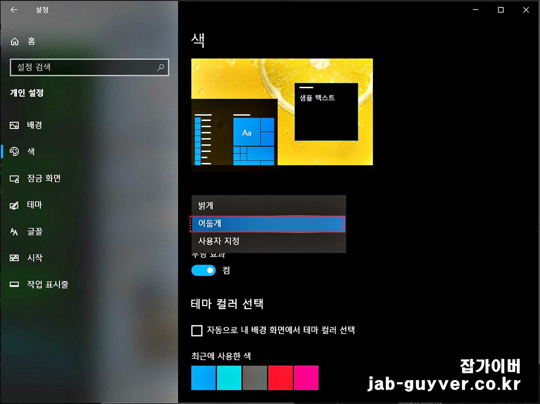 어둡게 색상을 선택하면 전체 테마색상이 어둡게 변하며 투명효과와 함께 테마 컬러를 내 배경화면 색상에 맞게 선택하는것이 가능합니다.