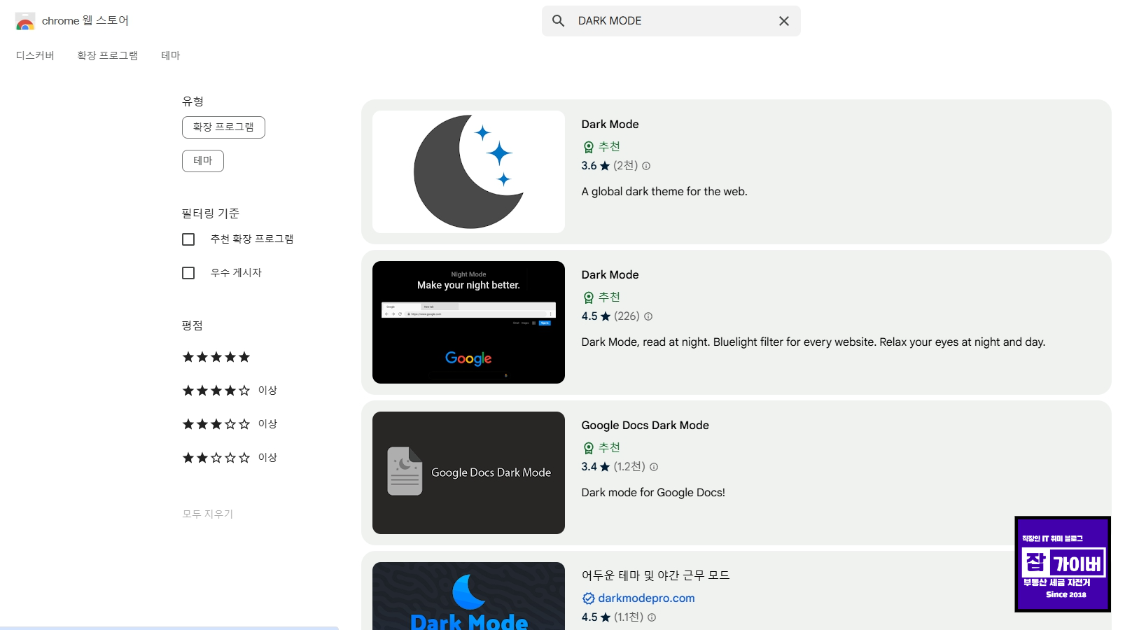 - 'Dark mode' 또는 '다크모드'를 검색한 뒤, 인기 있는 다크모드 테마를 설치합니다.