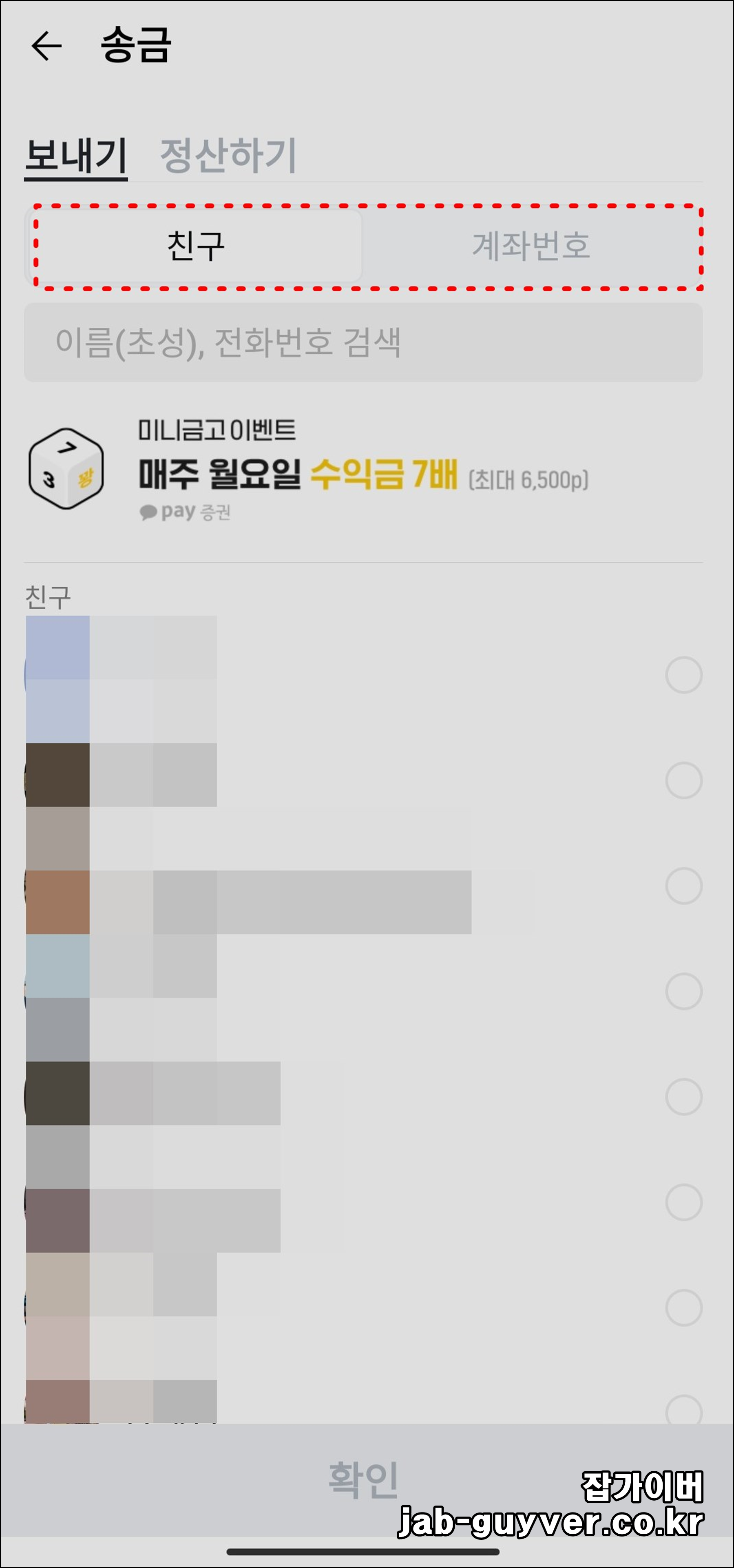 카카오톡 친구 중 송금하고자 하는 친구 목록을 선택합니다.