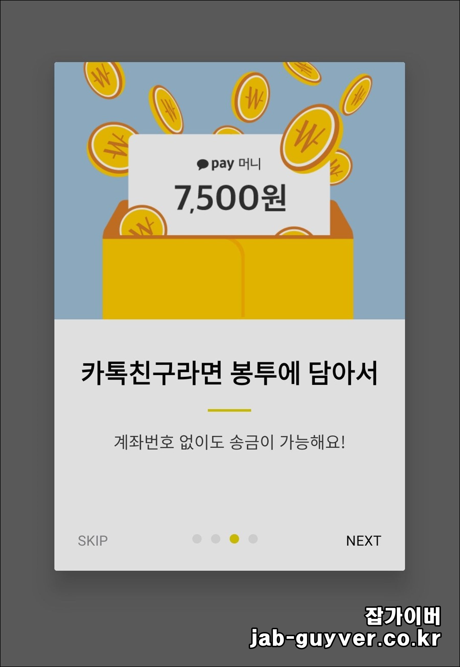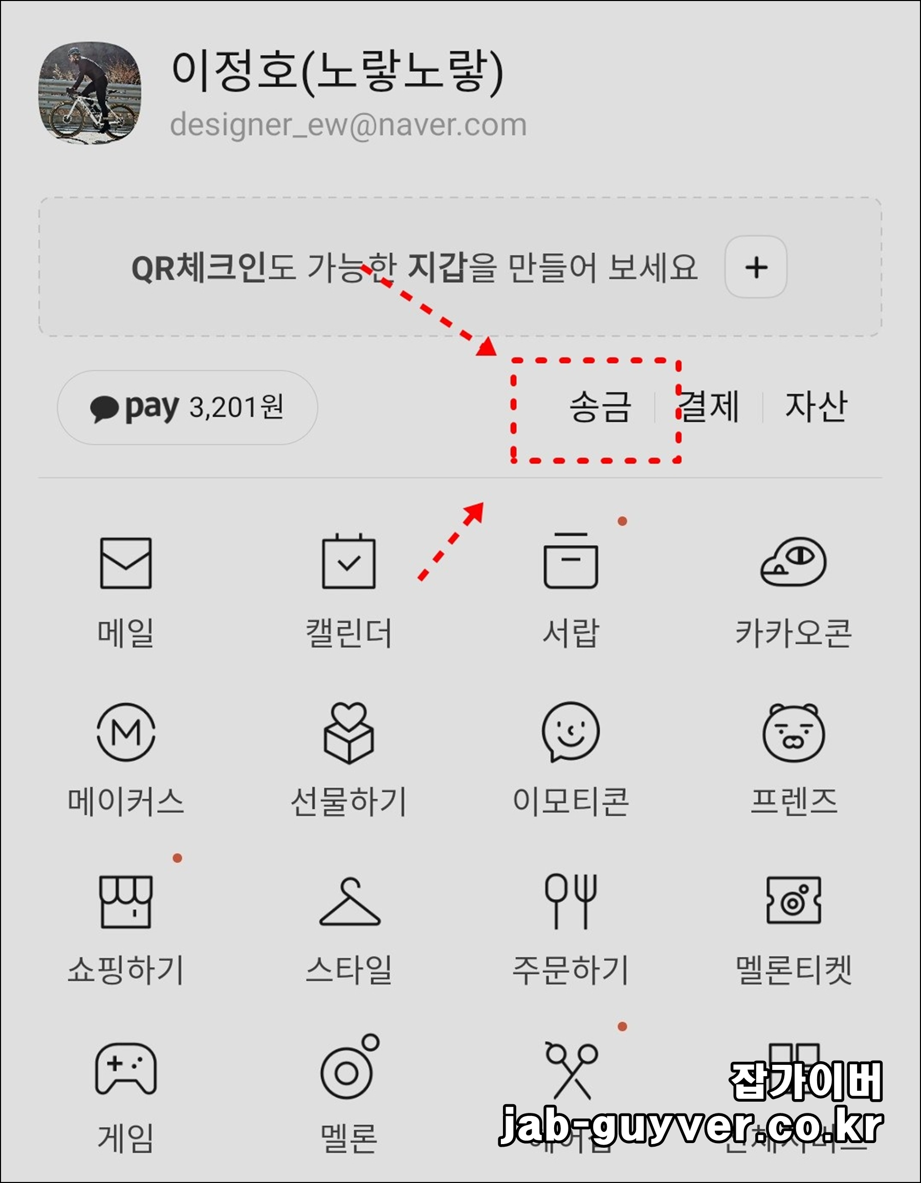 카카오톡 앱을 실행 후 송금을 선택하면 카카오페이가 실행됩니다.
