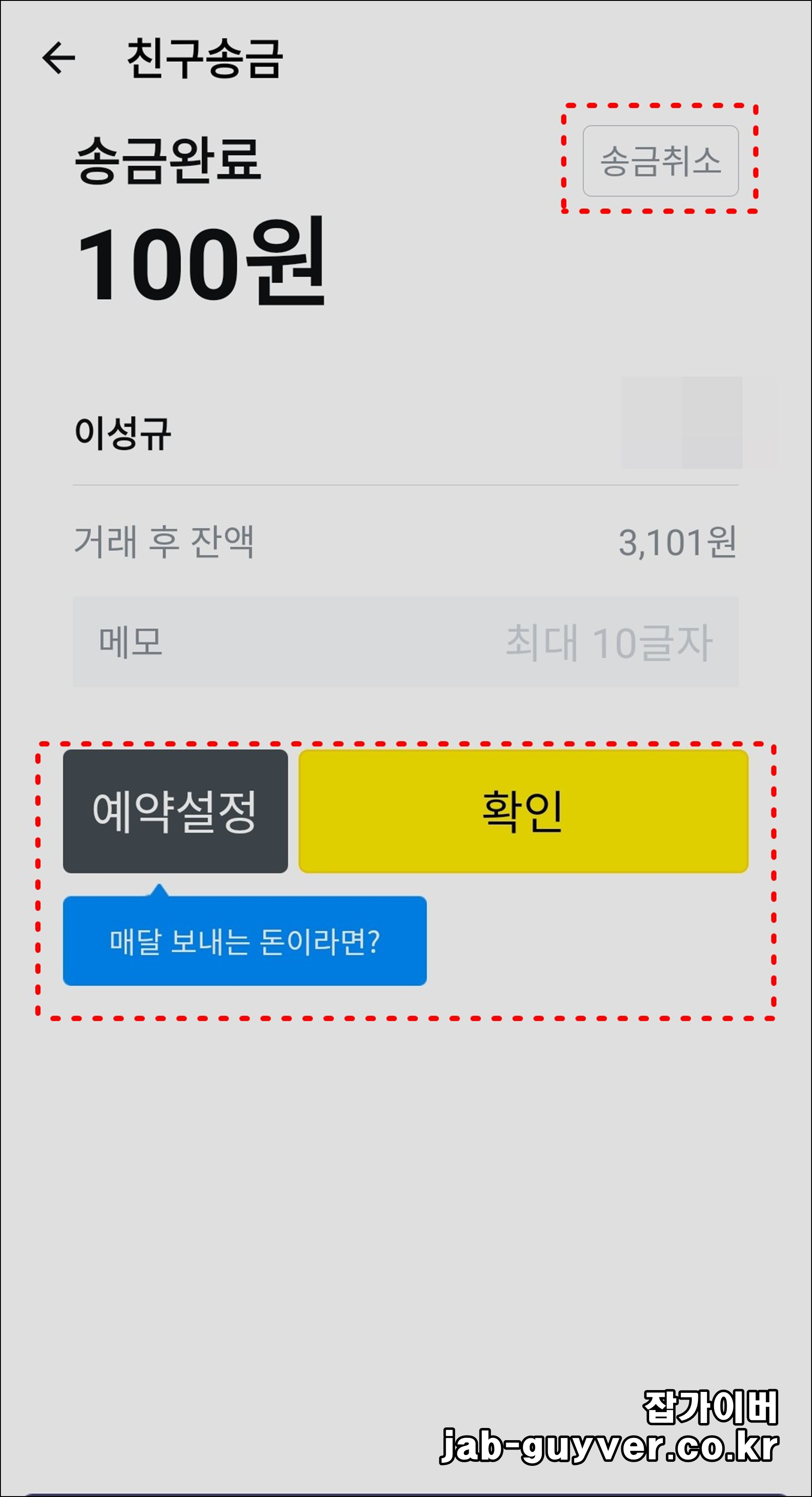 상대방이 돈을 받지 않았다면 언제든지 송금취소가 가능하며 예약설정을 통해 매달 원하는 기간별로 예약송금이 가능합니다.