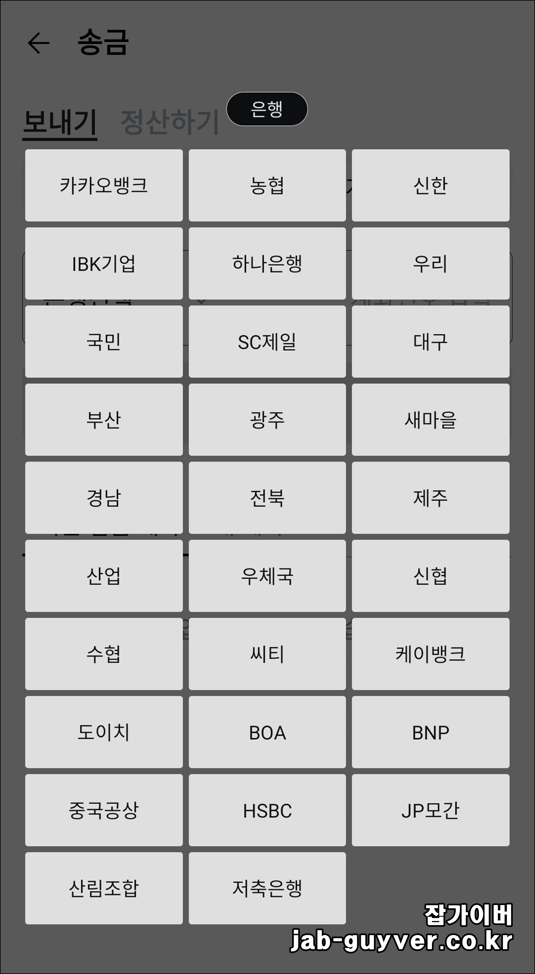 카카오 뱅크, 농협, 신협, ibk기업은행, 하나은행, 우리은행, 국민은행, sc제일은행, 대구은행, 부산은행, 광주은행, 새마을은행, 경남은행, 전북은행, 제주은행, 산업은행, 우체국, 신협, 수협, 시티뱅크, 케이 뱅크, 도이치, BOA, BNP, 중국 공상, HSBC, JP모간, 산림조합, 저축은행