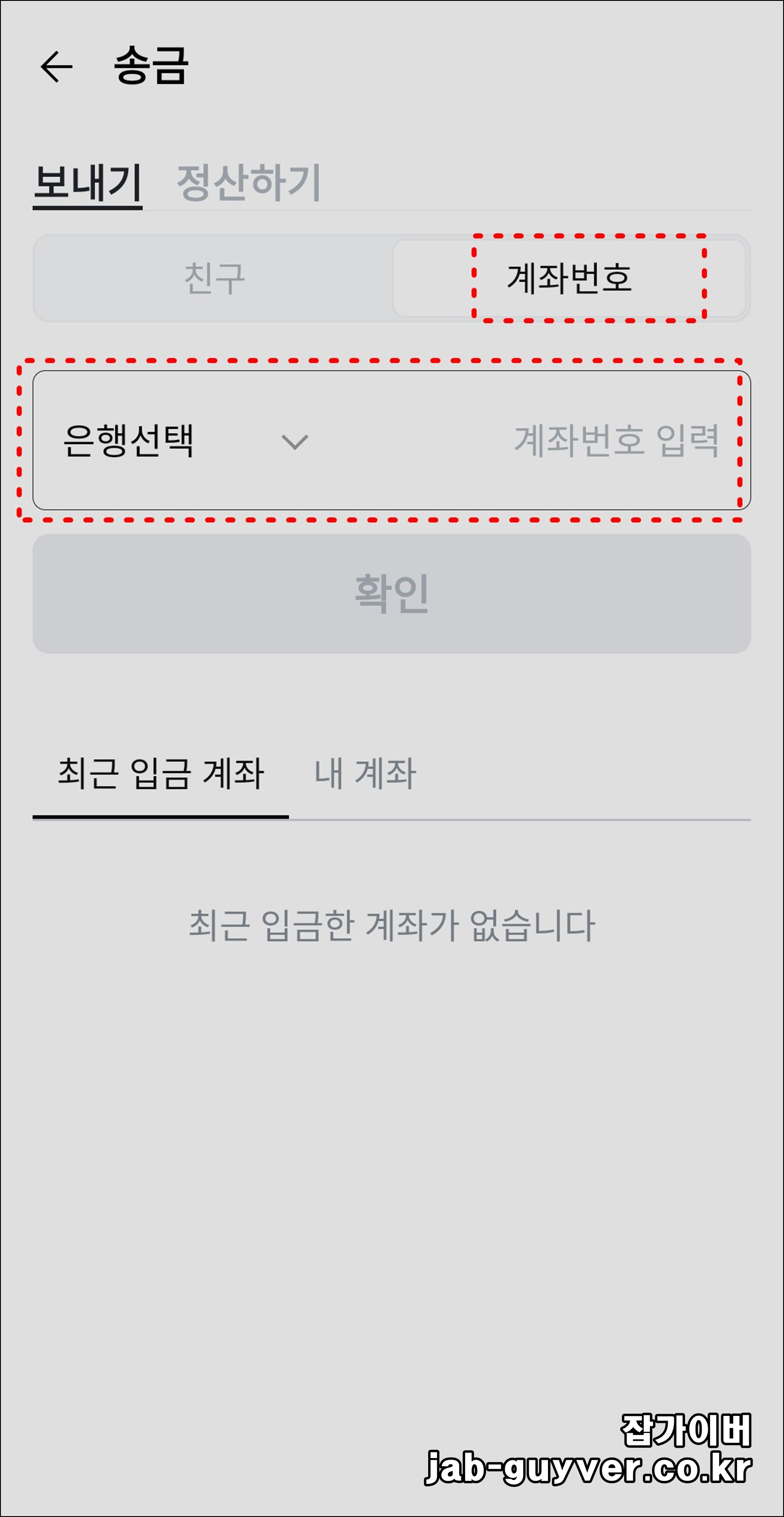 별도의 은행계좌로 보내고 싶다면 계좌번호 탭을 선택합니다.