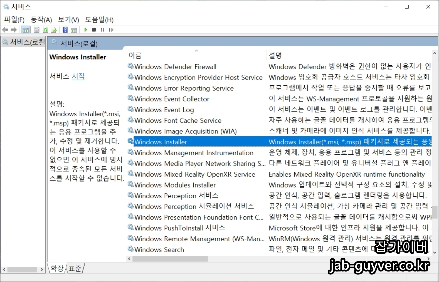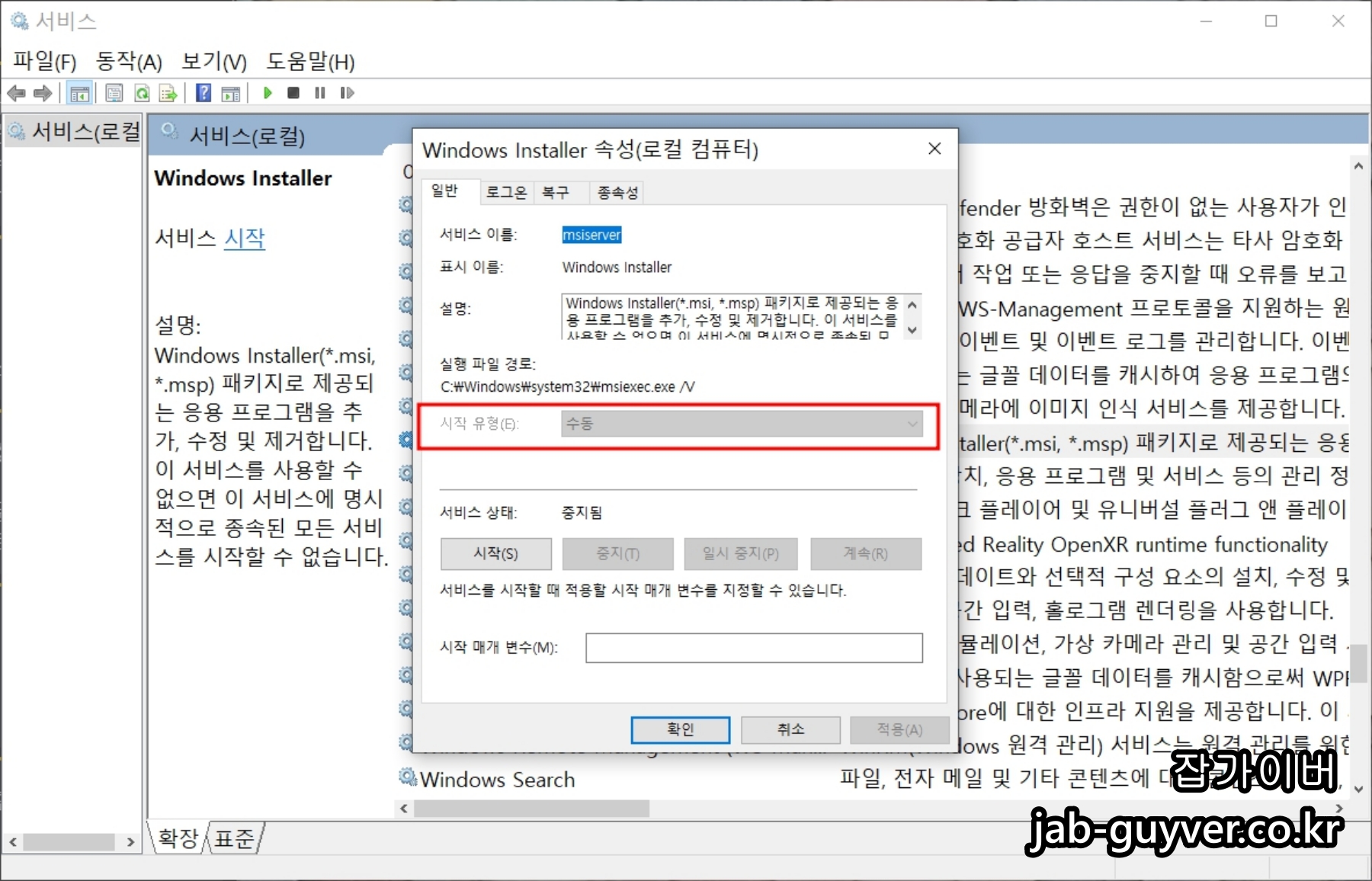 윈도우 키 + R에서 services.msc를 열고, Windows Installer 속성에서 시작 유형을 수동으로 바꿔둡니다.